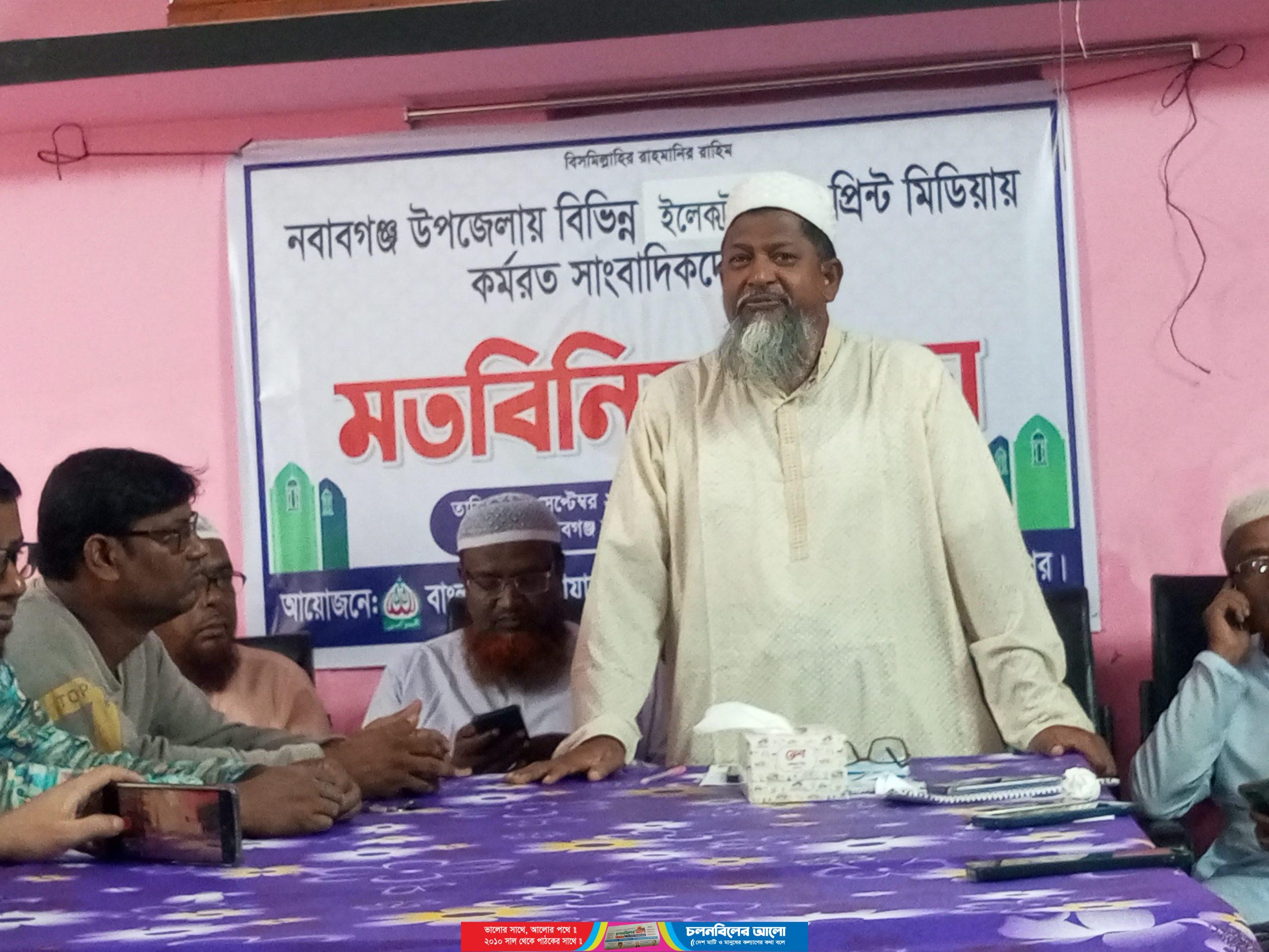 শনিবার সকালে জামায়াতে ইসলামী নবাবগঞ্জ উপজেলা শাখার আয়োজনে নবাবগঞ্জ সরকারি পাইলট উচ্চ বিদ্যালয়ের হলরুমে এ সভা অনুষ্ঠিত হয়। উপজেলা জামায়াতে ইসলামীর আমির নজরুল ইসলামের সভাপতিত্বে অনুষ্ঠিত মতবিনিময় সভায় প্রধান অতিথি হিসেবে জামায়াতে ইসলামীর দক্ষিণ জেলা শাখার আমির ও কেন্দ্রীয় মজলিশের শুরা সদস্য আনোয়ারুল ইসলাম বক্তব্য দেন। এ সময় দিনাজপুর জেলা নায়েবে আমির ড. মোহাদ্দেস এনামুল হক, জামায়াতে ইসলামীর উপজেলা সাবেক আমির নুরে আলম , বর্তমানে উপজেলা সেক্রেটারি রেজাউল ইসলাম, নবাবগঞ্জ প্রেসক্লাবের সভাপতি সুলতান মাহামুদ, সাধারণ সম্পাদক হাফিজুর রহমান মিলনসহ উপজেলায় কর্মরত সকল গণমাধ্যম কর্মীরা মতবিনিময় সভায় উপস্থিত ছিলেন।