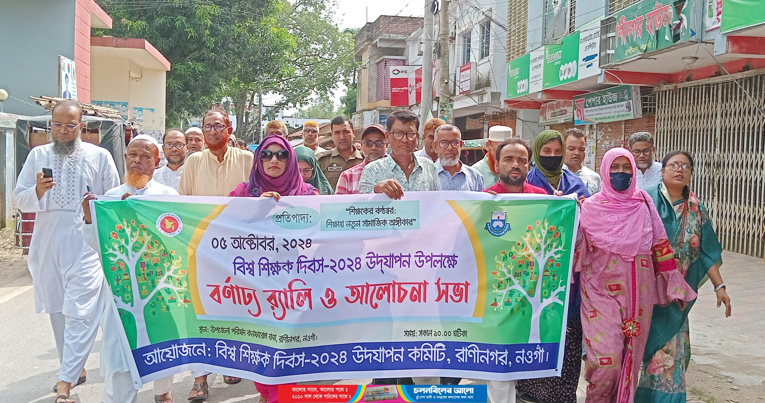 “শিক্ষকের কন্ঠস্বর: শিক্ষায় নতুন সামাজিক অঙ্গীকার” এই প্রতিপাদ্যকে সামনে রেখে নওগাঁর রাণীনগরে বিশ্ব শিক্ষক দিবস পালিত হয়েছে। দিবসটি উপলক্ষ্যে শনিবার উপজেলা বিশ্ব শিক্ষক দিবস উদযাপন কমিটির আয়োজনে বর্ণাঢ্য র‌্যালি ও আলোচনা সভা অনুষ্ঠিত হয়।