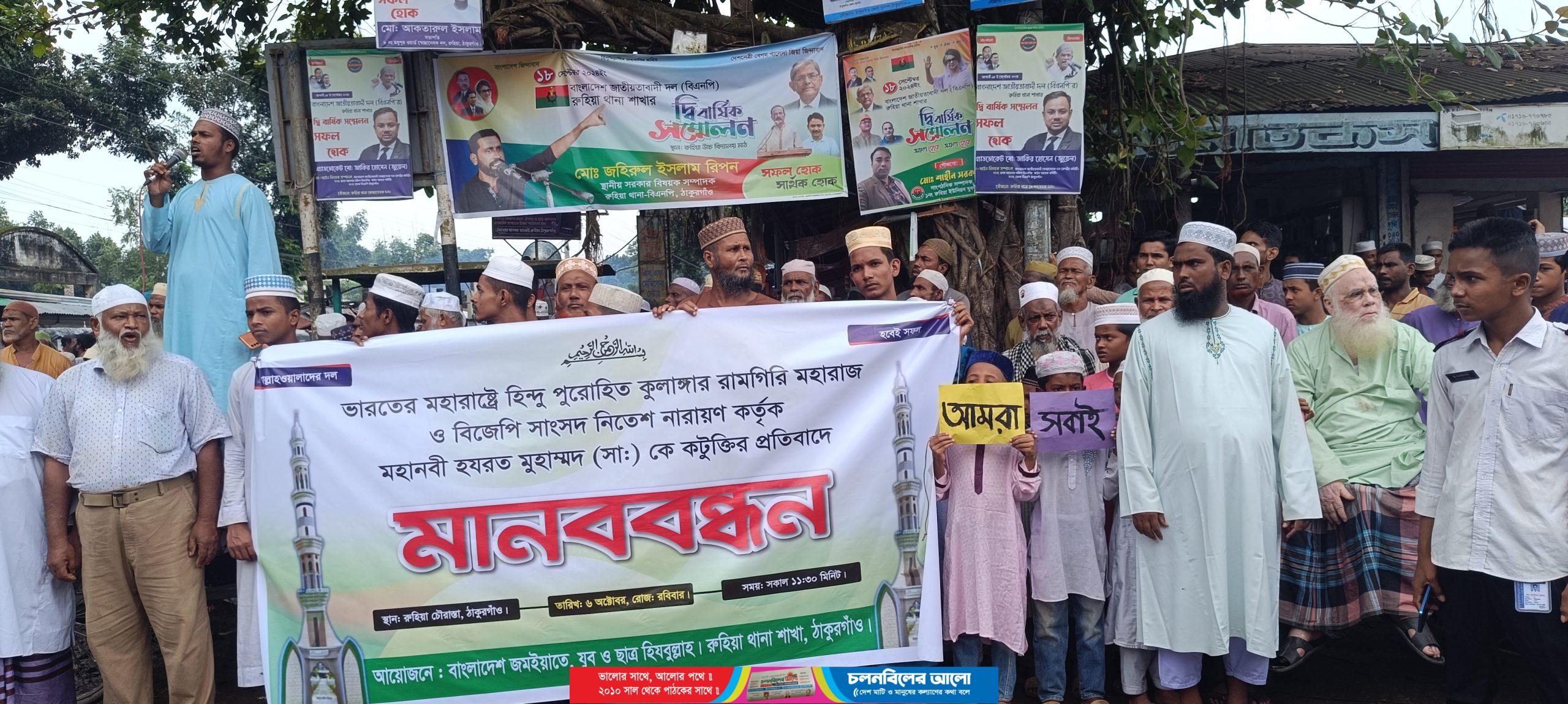 ভারতের মহারাষ্ট্রে হিন্দু পুরোহিত কুলাঙ্গার রামগিরি মহারাজ ও বিজেপির সাংসদ নীতেশ নারায়ণ কর্তৃক মহানবী হযরত মুহাম্মদ (সাঃ) কটুক্তি করার প্রতিবাদে ঠাকুরগাঁওয়ের রুহিয়ায় মানববন্ধন ও প্রতিবেশ সমাবেশ অনুষ্ঠিত হয়েছে। রবিবার ১১টায় বাংলাদেশ জমইয়াতে হিজবুল্লাহ রুহিয়া থানা শাখার উদ্যোগ রুহিয়া চৌরাস্তায় এ মানববন্ধন ও প্রতিবাদ সভা অনুষ্ঠিত হয়।