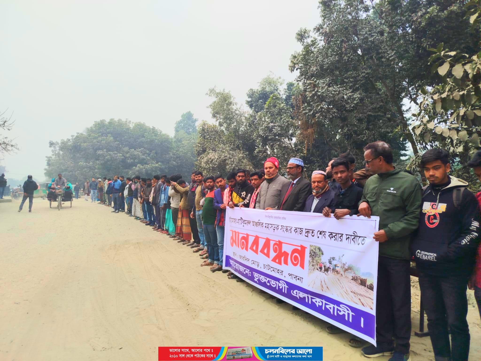 পাবনার চাটমোহর- হামকুড়িয়া সড়ক দ্রুত সংস্কারের দাবিতে বৃহস্পতিবার (৩০ জানুয়ারি) সকাল সাড়ে ১০টায় উপজেলার জার্দিস মোড় এলাকায় মানববন্ধন করেছে এলাকার সাধারণ মানুষ।
