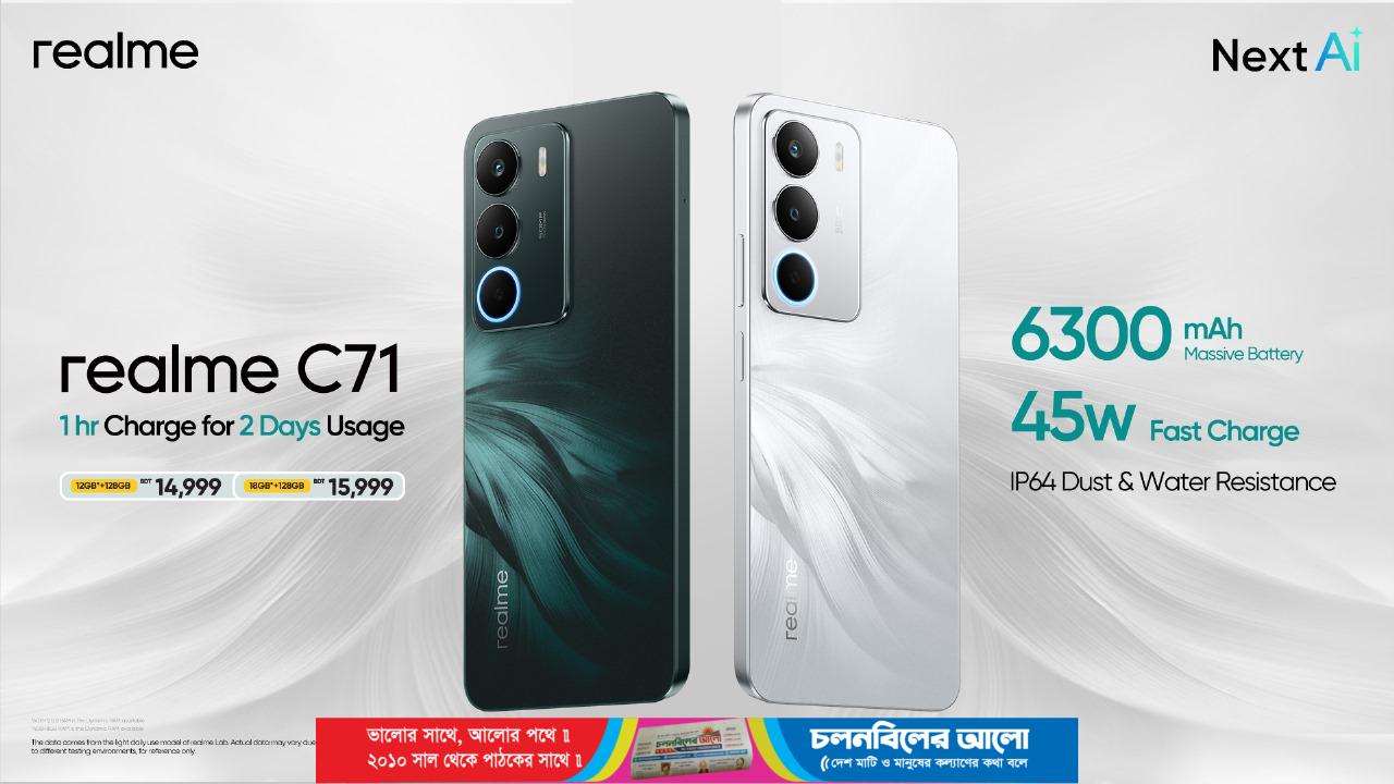 তরুণদের পছন্দের টেক ব্র্যান্ড রিয়েলমি বাংলাদেশের বাজারে তাদের সর্বশেষ স্মার্টফোন রিয়েলমি সি৭১ নিয়ে এসেছে। নিরবচ্ছিন্ন ব্যাটারি পারফরম্যান্স চাইছেন এমন ব্যবহারকারীদের জন্য এই ডিভাইসটি ডিজাইন করা হয়েছে। রিয়েলমি’র নতুন এই ফোনে দীর্ঘস্থায়ী ব্যাটারি লাইফ, এআই-সক্ষম ফিচার ও প্রাণবন্ত ডিসপ্লেসহ আধুনিক ও স্টাইলিশ ডিজাইন ব্যবহার করা হয়েছে।