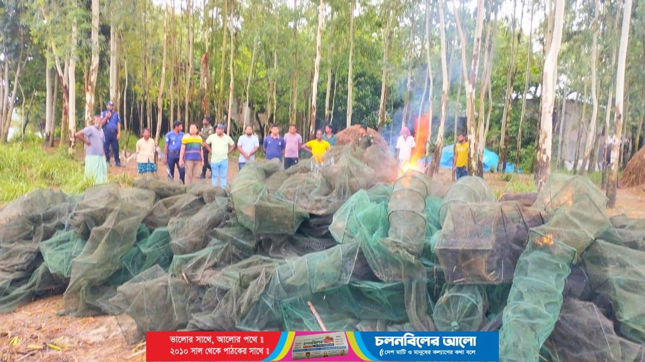 চাটমোহরে অবৈধ চায়না দুয়ারি জাল পুড়িয়ে ধ্বংস