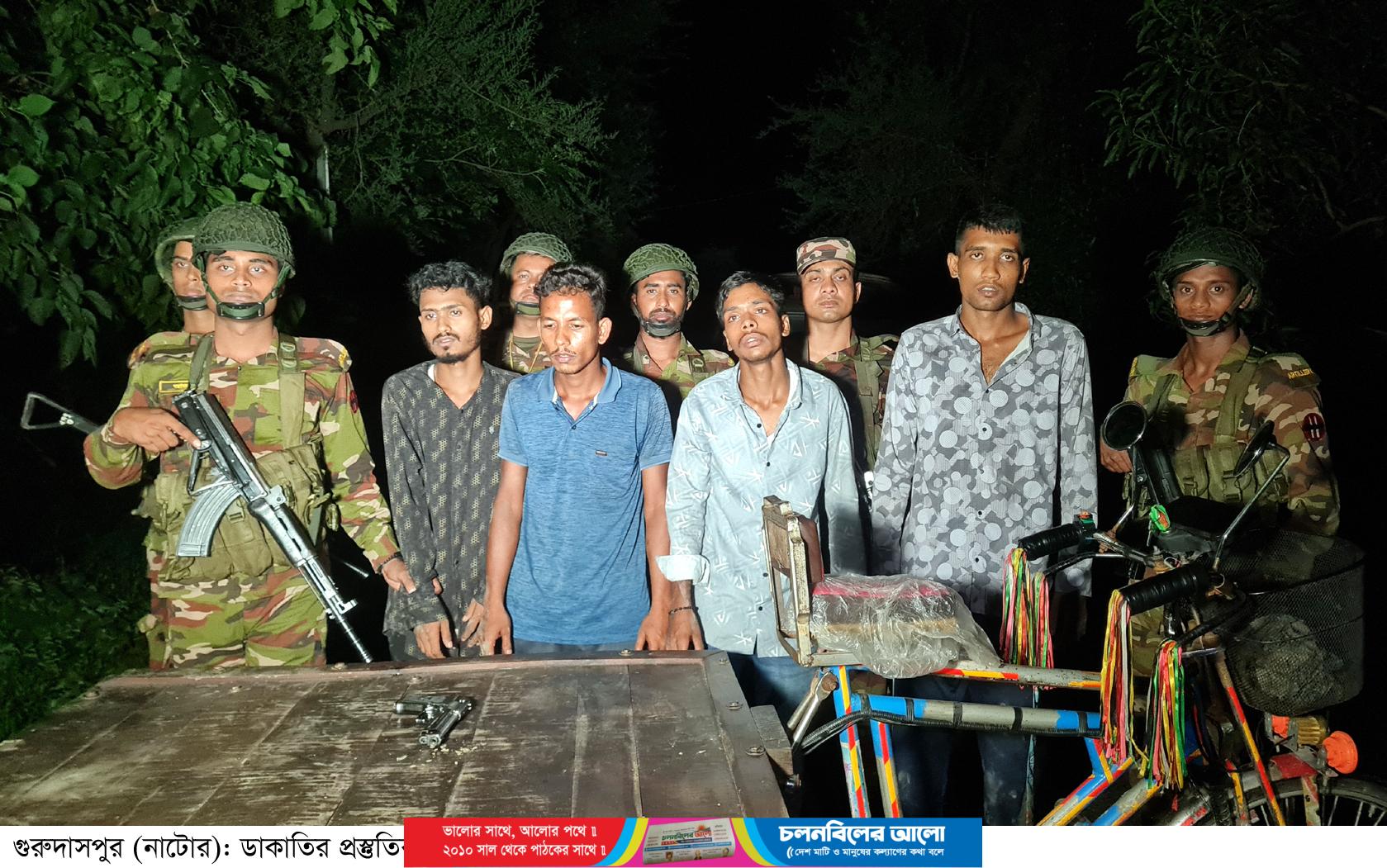 গ্রেপ্তারকৃত হলেন- উপজেলার নাজিরপুর গ্রামের ডাকাত দলের প্রধান সিরাজুল হকের ছেলে আব্দুর রাজ্জাক (৩৮) ও মৃত কামাল হোসেনের ছেলে কাওসার আহম্মেদ (২৫), আব্দুল আজিজের ছেলে বিপ্লব হোসেন (২৪), মোবারক আলীর পুত্র মবিদুল ইসলাম (২১), হরদমা গ্রামের রওশন আলীর ছেলে মনিরুল (২৪) ও কালিনগর পাধোয়া গ্রামের আব্দুল সালামের পুত্র সুরুজ আলী (২১)। তাদের কাছ থেকে দেশীয় অস্ত্র ও খেলনা পিস্তল উদ্ধার করা হয়েছে।