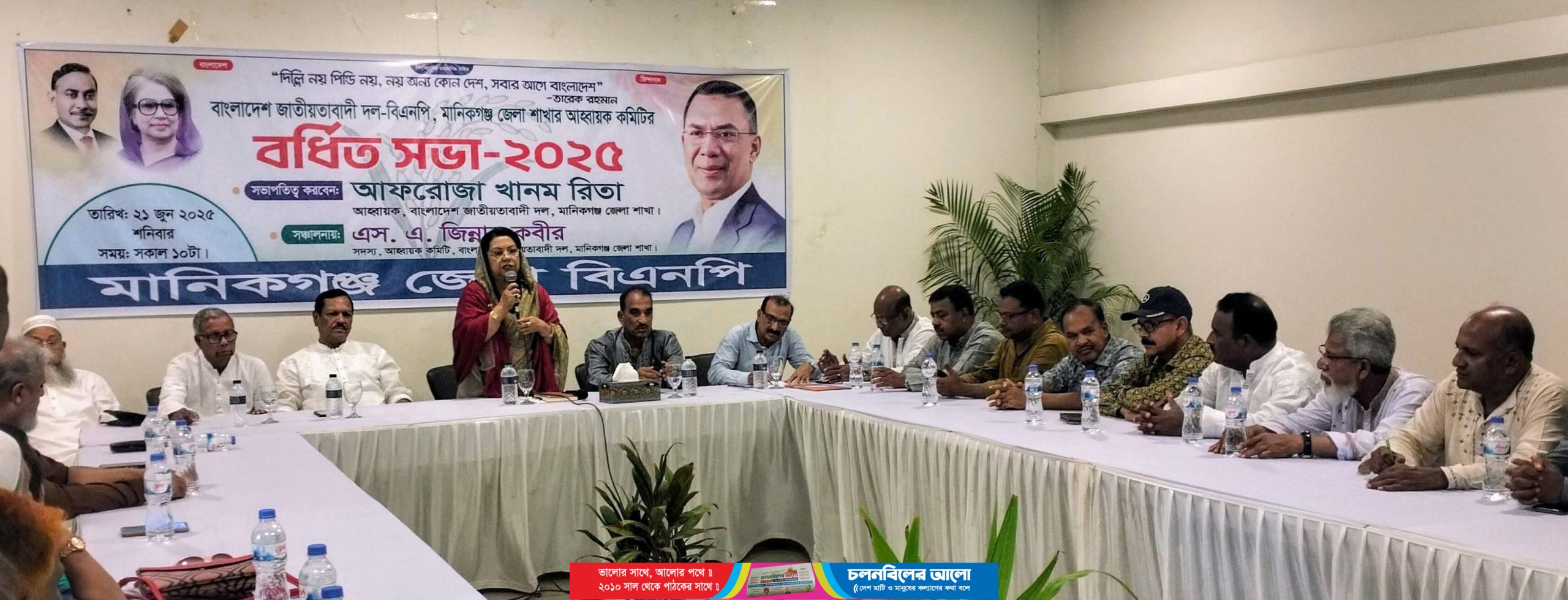 বিএনপি চেয়ারপার্সনের উপদেষ্টা ও মানিকগঞ্জ জেলা বিএনপির আহবায়ক আফরোজা খানম রিতা বলেছেন, ভেদাভেদ ভুলে যেয়ে আমাদের নেতা তারেক রহমানের হাতকে শক্তিশাল করতে হবে ত্যাগী নেতা কর্মীদেরকে মূল্যায়ন করতে হবে দলের বিভিন্ন অঙ্গ সংগঠনের কমিটিতেও ত্যাগী নেতা-কর্মীদের রাখতে হবে শনিবার (২১ জুন) সকালে গিলন্ড মুন্নু ক্যাফে রেস্তারাঁ মিলনায়তনে মানিকগঞ্জ জেলা বিএনপির আহবায়ক কমিটির বর্ধিত সভায় সভাপতির বক্তব্য একথা বলেন জেলা বিএনপির আহবায়ক কমিটির সদস্য এস. এ. জিন্নাহ কবীরের সঞ্চালনায় বর্ধিত সভায় আরো বক্তব্য রাখেন অ্যাড. আজাদ হোসেন খান, অ্যাড. এ এফ এম নূরতাজ আলম বাহার, অ্যাড. আ. ত. ম জহির আলম খান লোদী, অ্যাড. আতাউর রহমান ভুইয়া ফরিদ, গোলাম কিবরিয়া সাঈদ, সত্যেন কান্ত পন্ডিত ভজন, অ্যাড. মোকসেদুর রহমান, গোলাম আবেদীন কায়সার, আব্দুস সালাম বাদলসহ আহবায়ক কমিটির সদস্যবৃন্দ উপস্থিত ছিলেন।
