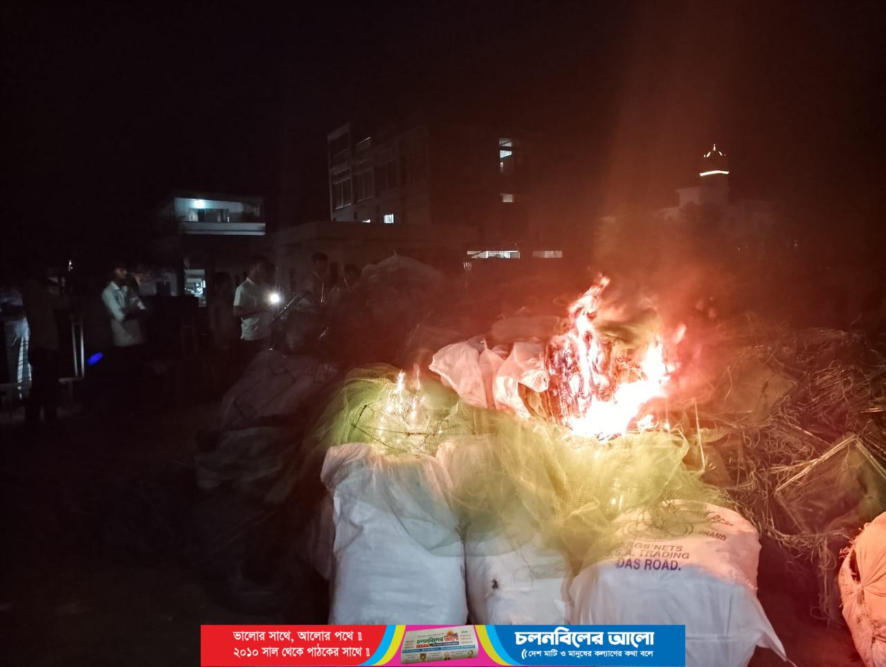 জব্দ করা নিষিদ্ধ জালগুলো জনসম্মুখে পুড়িয়ে ধ্বংস করা হয়।