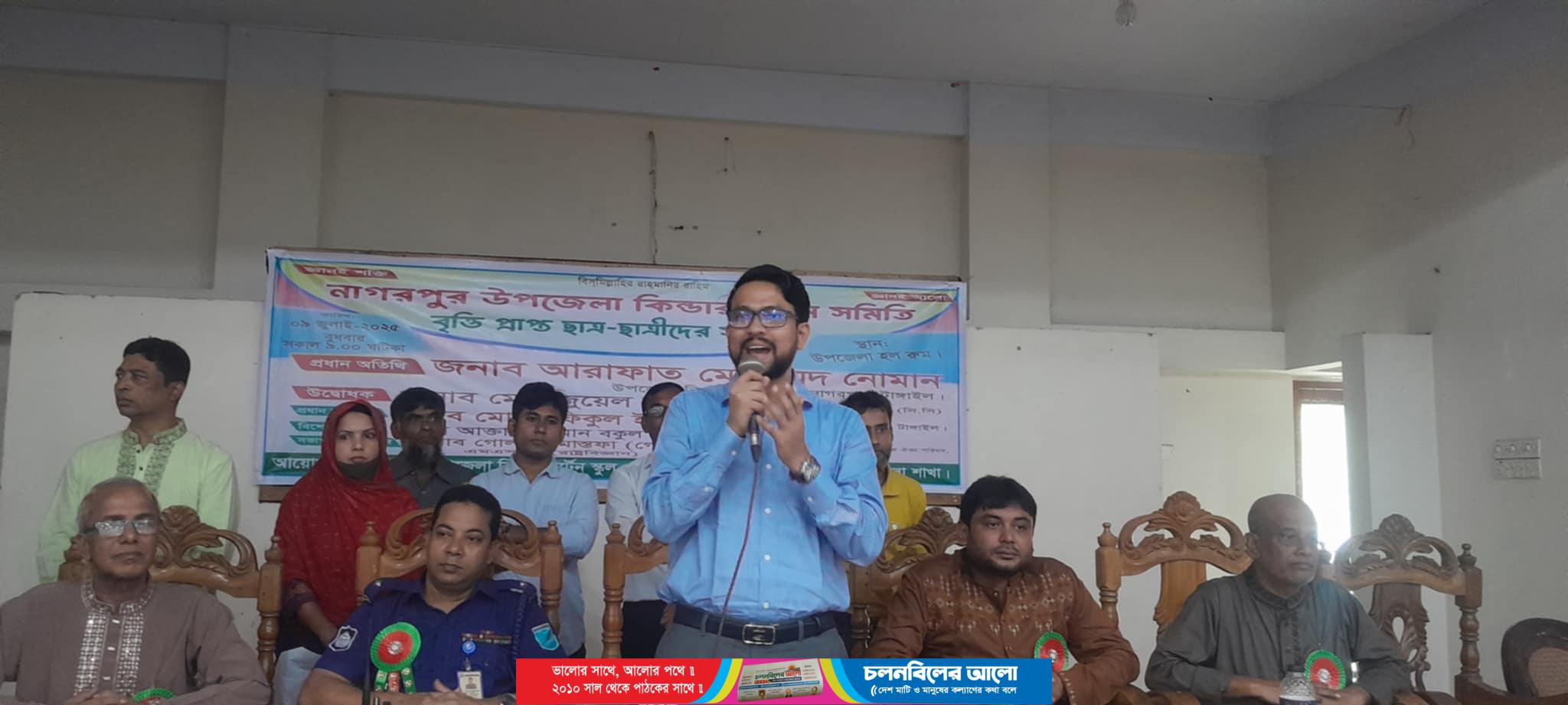 টাঙ্গাইলের নাগরপুর উপজেলা কিন্ডারগার্টেন সমিতির বৃত্তিপ্রাপ্ত ছাত্র-ছাত্রীদের সংবর্ধনা ও ক্রেস্ট প্রদান করা হয়েছে। বুধবার (০৯ জুলাই) সকালে উপজেলা পরিষদ হল রুমে নাগরপুর উপজেলা কিন্ডারগার্টেন স্কুল এন্ড কলেজ ঐক্য পরিষদ নাগরপুর উপজেলা শাখা এ অনুষ্ঠানের আয়োজন করে। সমিতির  সভাপতি গোলাম মোস্তফা গোলামের সভাপতিত্বে ও সমিতির সাধারন সম্পাদক  যদুনাথ কিন্ডার গার্টেনের প্রধান শিক্ষক আরিফিন মিতালির সঞ্চলনায় অনুষ্ঠানে প্রধান অতিথি হিসেবে উপস্থিত ছিলেন, নাগরপুর উপজেলা নিবার্হী অফিসার আরাফাত মোহম্মদ নোমান। প্রধান বক্তা হিসেবে উপস্থিত ছিলেন, নাগরপুর থানার অফিসার ইনচার্জ (ওসি) মো. রফিকুল ইসলাম। অনুষ্ঠানটি উদ্বোধন করেন বিশিষ্ট শিক্ষানুরাগী ক্রীড়াবিধ ও সমাজ সেবক বি.বি.এ.এম,বি.এ সি এ (সি.সি) টাঙ্গাইল-৬ আসনে বিএনপি থেকে মনোনয়ন প্রত্যাশী মো. জুয়েল সরকার। অনুষ্ঠানে বিশেষ অতিথি হিসেবে আরো উপস্থিত ছিলেন, সরকারি যদুনাথ পাইলট স্কুল এন্ড কলেজের ভারপ্রাপ্ত প্রধান শিক্ষক মো. শফিকুল ইসলাম সবুজ, নাগরপুর প্রেসক্লাবের সভাপতি আক্তারুজ্জামান বকুল ও সাধারণ সম্পাদক এরশাদ মিয়া।
