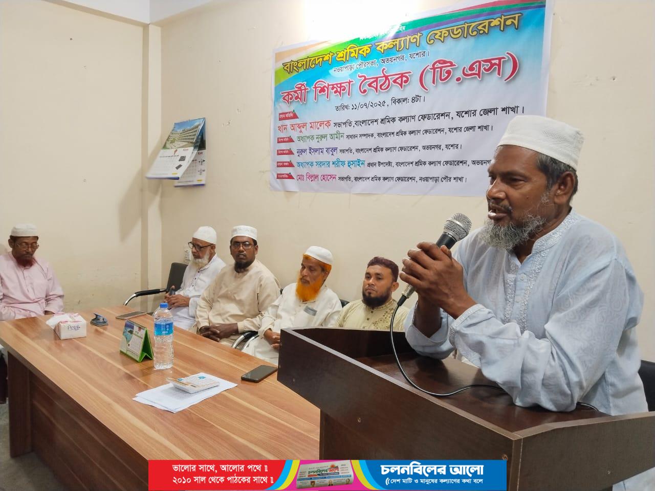 যশোরের অভয়নগরে বাংলাদেশ শ্রমিক কল্যাণ ফেডারেশন নওয়াপাড়া পৌর শাখার উদ্যোগে কর্মী শিক্ষা বৈঠক অনুষ্ঠিত হয়েছে। শুক্রবার ১১ জুলাই বিকাল ৪ টার সময় বাংলাদেশ শ্রমিক কল্যাণ ফেডারেশন অভয়নগর উপজেলার কার্যালয়ে অনুষ্ঠিত হয়। ওই কর্মী শিক্ষা সমাবেশে প্রধান অতিথি হিসাবে উপস্থিত ছিলেন বাংলাদেশ শ্রমিক কল্যাণ ফেডারেশনের যশোর জেলার সভাপতি আব্দুল মালেক খান। এতে প্রধান বক্তা অধ্যাপক সর্দার শরীফ হোসেন আমীর বাংলাদেশ জামায়াতে ইসলামী অভয়নগর উপজেলা। বিশেষ অতিথি -অধ্যাপক নুরুল আমিন জেলা সাধারণ সম্পাদক, বিশেষ অতিথি জনাব নুরুল ইসলাম বাবুল, সভাপতি বাংলাদেশ শ্রমিক কল্যাণ ফেডারেশন অভয়নগর উপজেলা, মোঃ ইউনুছ আকুঞ্জি ,সাধারণ সম্পাদক বাংলাদেশ শ্রমিক কল্যাণ ফেডারেশন অভয়নগর উপজেলা, ওই অনুষ্ঠানের সভাপতিত্ব করেন, পৌর সভাপতি জনাব বেলাল হোসেন ,অনুষ্ঠান পরিচালনা করেন পৌর সাধারণ সম্পাদক অধ্যাপক হুমায়ুন কবির ।