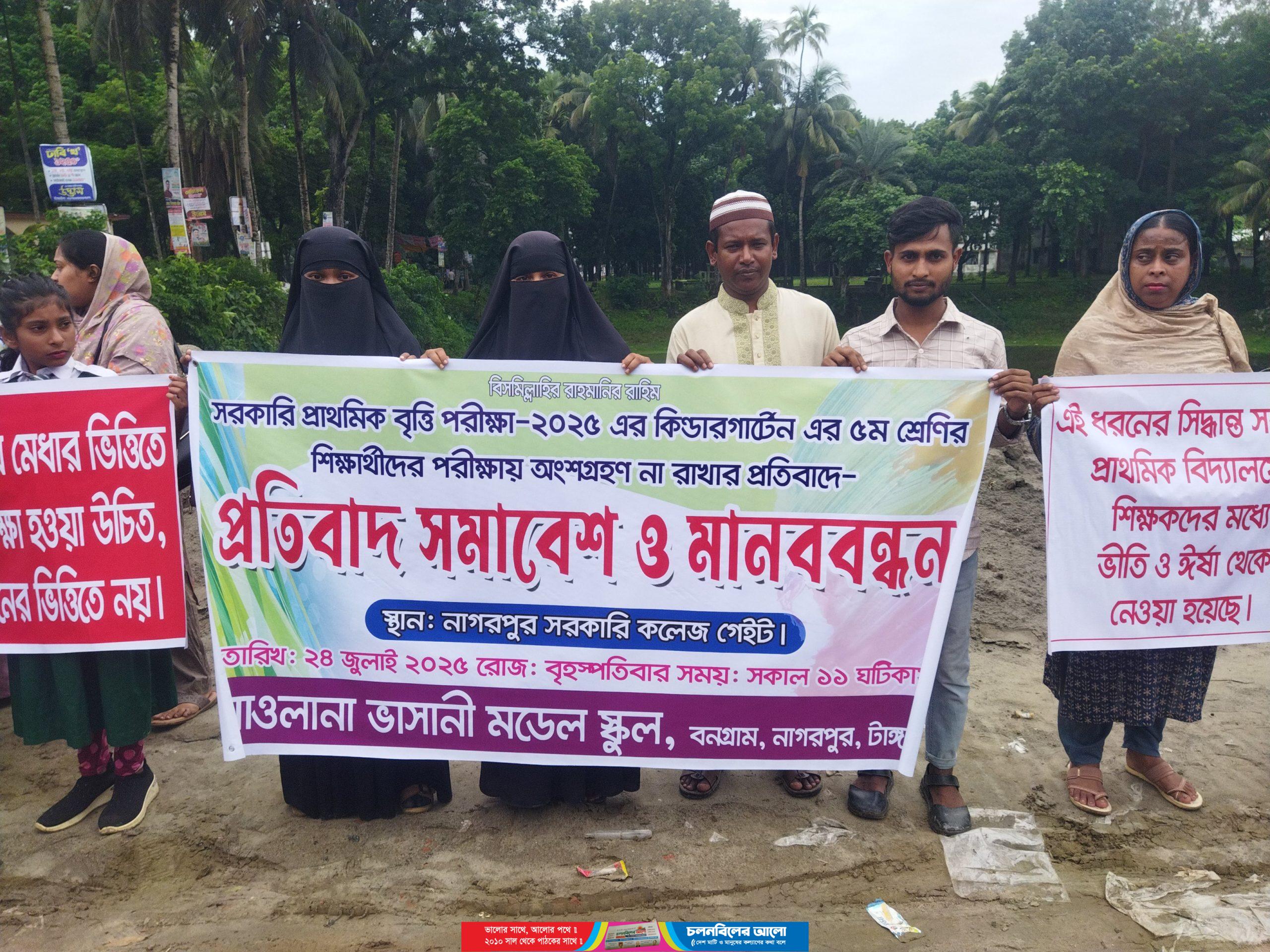 প্রাথমিক বৃত্তি পরীক্ষায় বৈষম্যের বিরুদ্ধে নাগরপুরে কিন্ডারগার্টেন শিক্ষার্থীদের মানববন্ধন