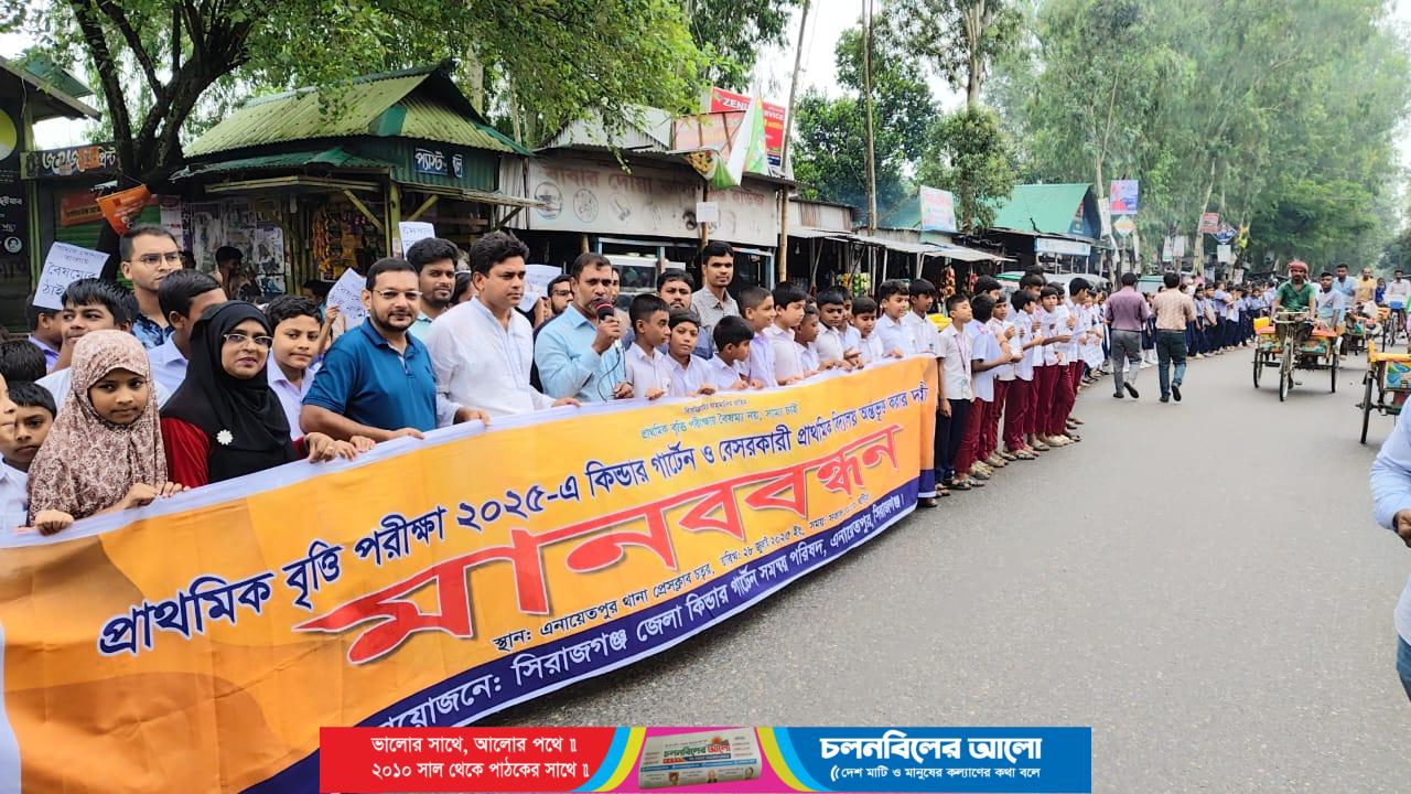 প্রাথমিক বৃত্তি পরীক্ষায় সারাদেশের কিন্ডারগার্টেন ও বেসরকারি প্রাথমিক বিদ্যালয়ের শিক্ষার্থীদের দ্রুত অন্তর্ভুক্তির দাবিতে সিরাজগঞ্জের এনায়েতপুরে মানববন্ধন কর্মসূচি পালন করা হয়েছে।