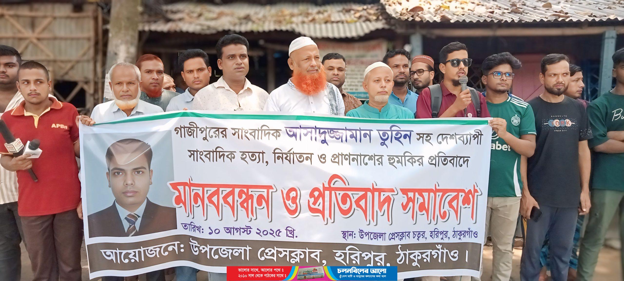 রবিবার (১০ আগস্ট) সকাল সাড়ে ১১টায় হরিপুর উপজেলা প্রেস ক্লাবের সামনে আয়োজিত এ মানববন্ধনে স্থানীয় সাংবাদিকসহ সুশীল সমাজের লোকজন উপস্থিত ছিলেন।