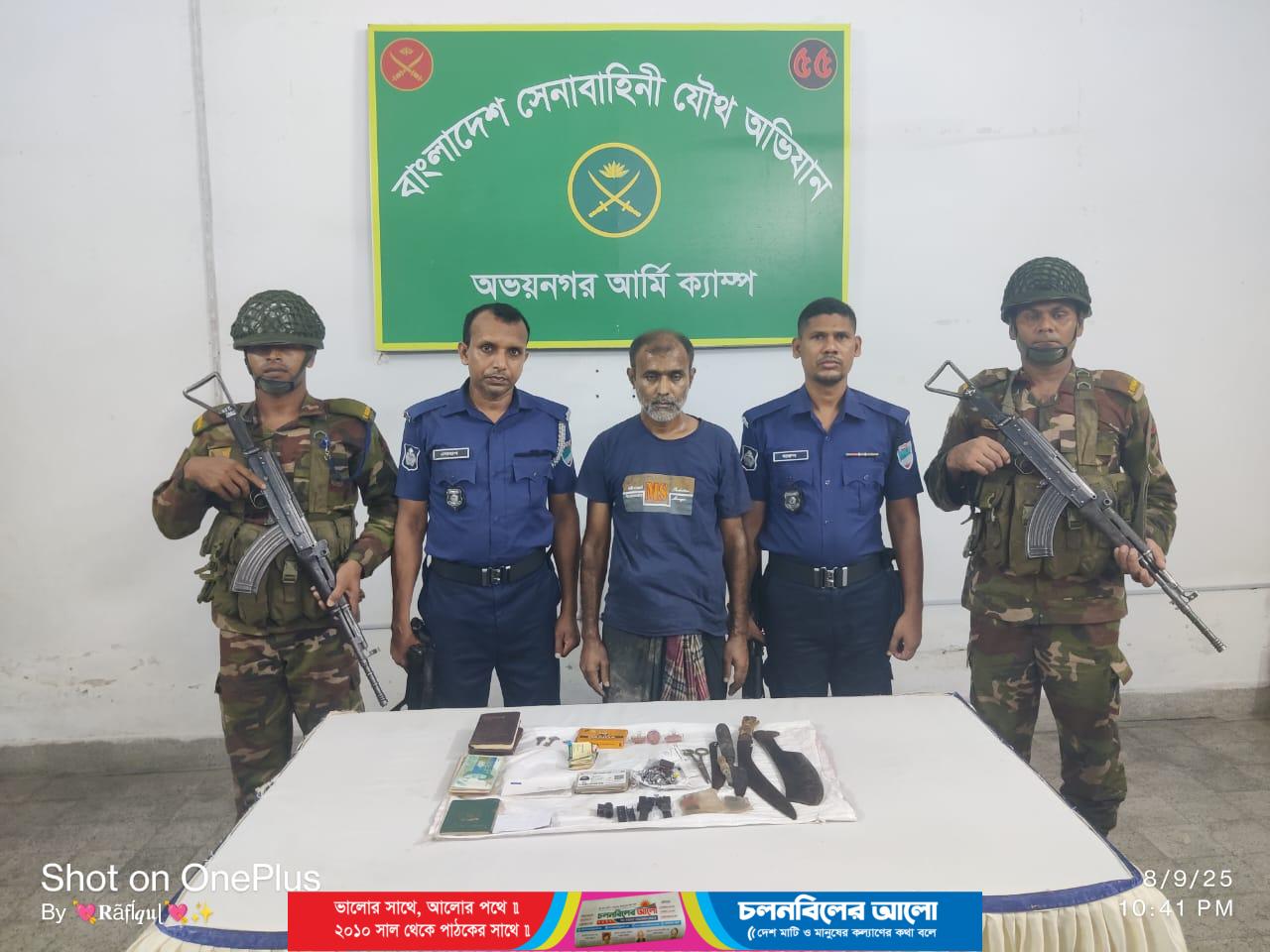অভয়নগর আর্মি ক্যাম্প সেনাবাহিনী আজ ৯ আগস্ট সন্ধ্যা ৮টা ৪০ মিনিটে বকুলতলা ভাড়া বাড়ী থেকে সাইদ মোল্লাকে আটক করে। তার নিকট থেকে উদ্ধার করা হয়েছে দুইটি এন্ড্রয়েড মোবাইল, এক বাটন মোবাইল, পাসপোর্ট, বিভিন্ন দেশের ডলার, দুইটি চাপাতি, দুইটি চাকু, বন্দুকের বিভিন্ন যন্ত্রাংশ , ১২টি আইডি কার্ড, পুলিশ সীলমোহর ৩টি, এয়ারগানের বুলেট ও একটি কেঁচি। এলাকাবাসী জানান, সেনাবাহিনীর নাম ভাঙিয়ে এসব অবৈধ কার্যকলাপ চালানো সাইদ মোল্লা ও তার সহযোগীদের আচরণে পুরো এলাকায় গভীর আতঙ্ক বিরাজ করছে। তারা দ্রুত আইনশৃঙ্খলা বাহিনীর কঠোর ব্যবস্থা গ্রহণ এবং দৃষ্টান্তমূলক বিচারের মাধ্যমে এলাকার নিরাপত্তা পুনঃপ্রতিষ্ঠার দাবি জানিয়েছেন।