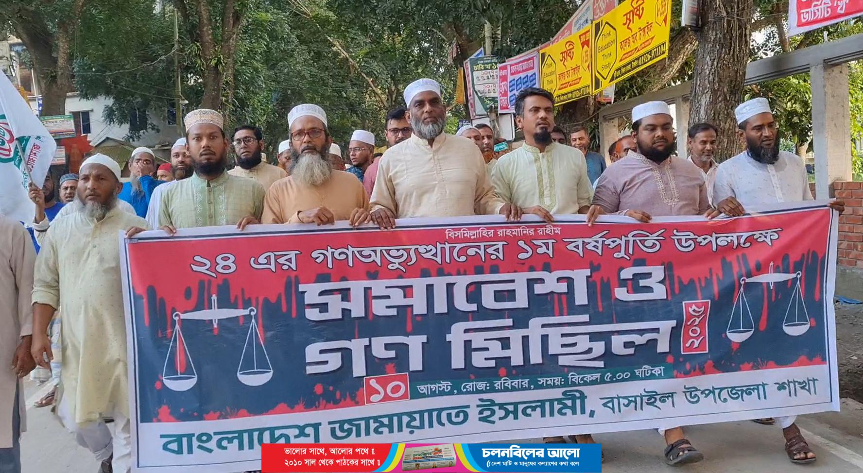 ২৪-এর গণঅভ্যুত্থানের ১ম বর্ষপূর্তি উপলক্ষ্যে টাঙ্গাইলের বাসাইলে জামায়াতে ইসলামীর সমাবেশ ও গণমিছিল অনুষ্ঠিত হয়েছে। রবিবার (১০ আগস্ট) বিকেলে উপজেলা জামায়াতে ইসলামীর উদ্যোগে মিছিলটি উপজেলা মডেল মসজিদের সামনে থেকে বের হয়ে পৌর এলাকার বিভিন্ন গুরুত্বপূর্ণ সড়ক পদক্ষিণ করে। মিছিল শেষে তারা বাসাইল জিরো পয়েন্ট সমাবেশ করে। এসময় বক্তব্য রাখেন জেলা জামায়াতে ইসলামীর অ্যাসিস্ট্যান্ট সেক্রেটারী অধ্যাপক শফিকুল ইসলাম খান, উপজেলা জামায়াতে ইসলামীর আমির আফজাল হোসেন প্রমুখ। এসময় বাসাইল পৌর জামায়াতে ইসলামীর আমির ফরিদ হোসাইন ও সেক্রেটারী আরিফুজ্জামান স্বপনসহ উপজেলার বিভিন্ন এলাকার জামায়াতে ইসলামীর নেতাকর্মীরা উপস্থিত ছিলেন। অনুষ্ঠানের সঞ্চালনা করেন উপজেলা জামায়াতে ইসলামীর সেক্রেটারী আমিনুল ইসলাম খান।