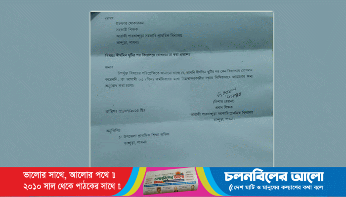 পাবনার ভাঙ্গুড়ায় আরাজি পার-ভাঙ্গুড়া সরকারি প্রাথমিক বিদ্যালয়ের এক সহকারী শিক্ষককে শোকজ নোটিশ ঘিরে এলাকায় ব্যাপক বিতর্কের সৃষ্টি হয়েছে। শোকজ নোটিশ বিলম্বে পৌঁছানোয় প্রধান শিক্ষকের ভূমিকা নিয়ে প্রশ্ন তুলেছেন স্থানীয়রা।