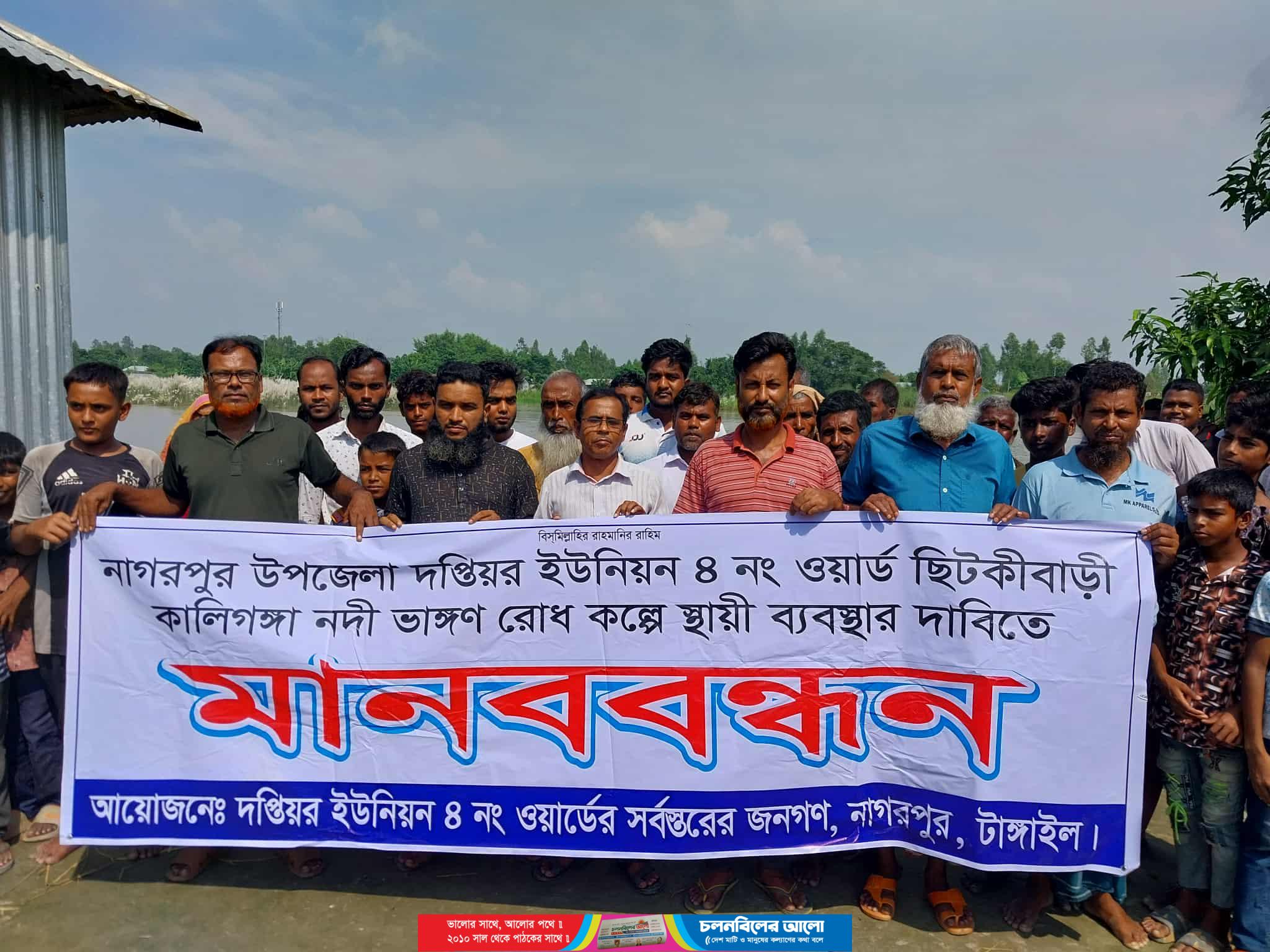 টাঙ্গাইলের নাগরপুর উপজেলার দপ্তিয়র ইউনিয়নের ৪ নম্বর ওয়ার্ডের ছিটকীবাড়ী, মাইঝাইল ও কামুটিয়া গ্রামবাসীর উদ্যোগে যমুনার শাখা নদী কালিগঙ্গার ভয়াবহ ভাঙন রোধে মানববন্ধন অনুষ্ঠিত হয়েছে। বৃহস্পতিবার সকালে শতাধিক মানুষ এ কর্মসূচিতে অংশ নেন।