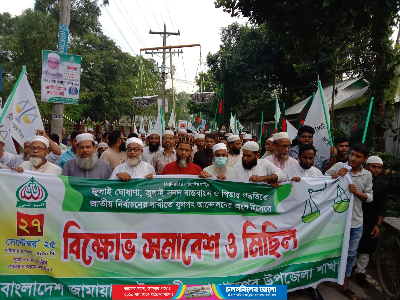 আইনি ভিত্তি সহ জুলাই সনদ বাস্তবায়ন। লেভেল প্লেইং ফিল্ড তৈরি এবং পিআর পদ্ধতিতে জাতীয় নির্বাচনসহ ৫ দফা দাবিতে বাংলাদেশ জামায়াতে ইসলামী গোপালপুর উপজেলা শাখা বিক্ষোভ মিছিল ও সমাবেশ করেছে। শনিবার (২৭ সেপ্টেম্বর) বিকেলে উপজেলার পৌর শহরের সুতী গোরস্থান কেন্দ্রিয় জামে মসজিদ থেকে মিছিলটি শুরু হয়ে গোপালপুর শহরের বিভিন্ন সড়ক প্রদক্ষিণ শেষে  গোপালপুর বাজারে সমাবেশের মাধ্যমে শেষ হয়।