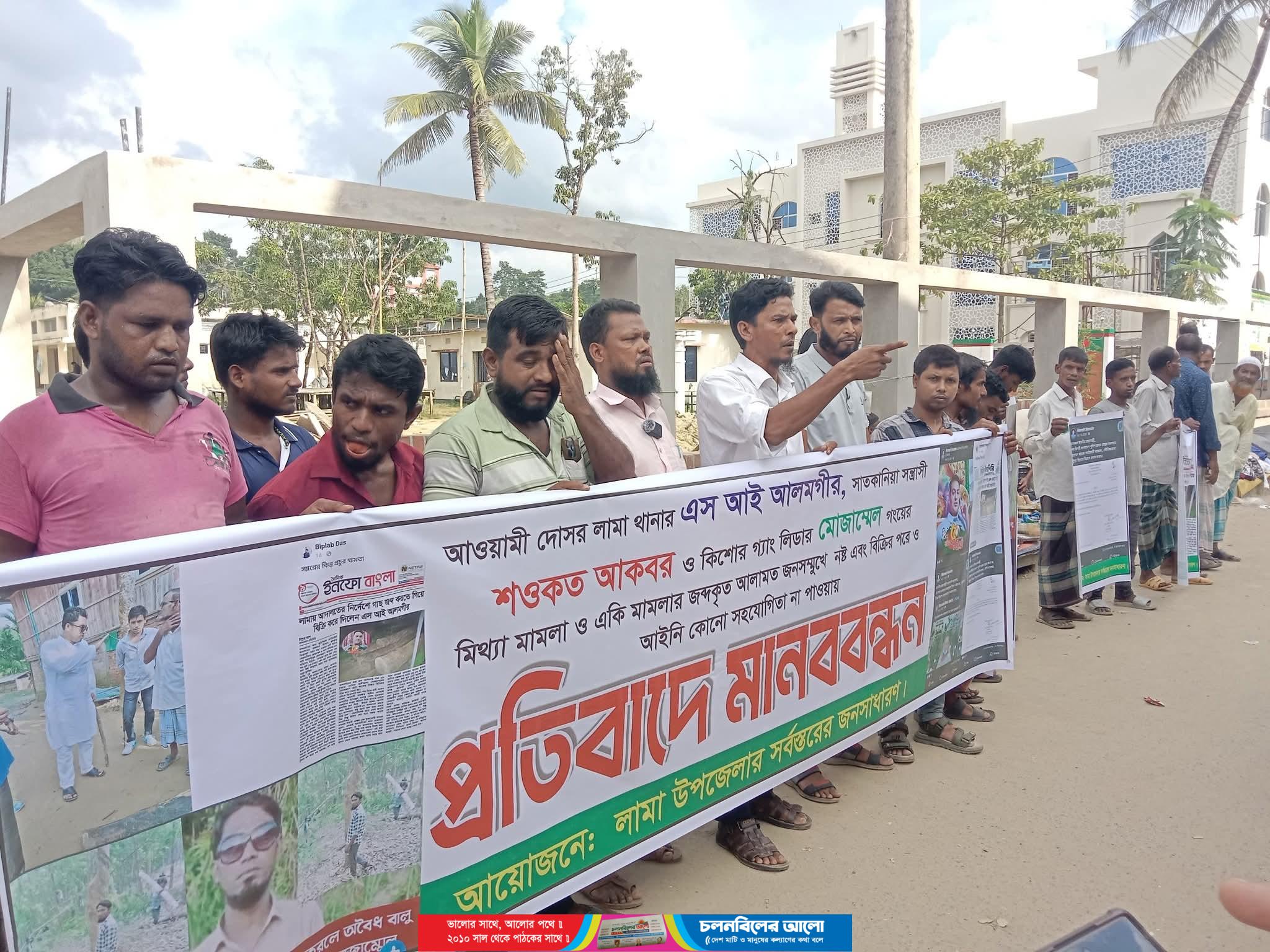 মানববন্ধন বক্তব্য বলেন, লামা বাসি কয়েকজন গণমাধ্যম কর্মি কে মিথ্যা মামলার দিয়ে হয়ারনি করেছে বলে অভিযোগ লিপি চট্টগ্রাম রেঞ্জ ডি আইজি। মাধ্যম কর্মী কে আওয়ামী লীগের দোসর উপজেলা চেয়ারম্যান ড্রাইভার জিয়াউর রহমান মাদক খাওয়া সরকারি কোয়ার্টারে খাওয়া অবেস্তায় নিউজ করাই মামলায় ফাঁসানোর অভিযোগ উঠেছে স্থানীয় থানার পুলিশ পরিদর্শকের (এসআইয়ের)আলমগীর মানুষকে হয়রানি করে টাকা আদায় যেন এএসআই আলমগীর নেশা’, তদন্তে পুলিশ সদরদপ্তর।মামলা মীমাংসার নামে এসআইয়ের ঘুষ বাণিজ্যের অভিযোগ পাহাড়। বান্দরবানের লামা উপজেলায় আদালতের জব্দের নির্দেশনা অমান্য করে জব্দকৃত গর্জন কাঠ বিক্রির অভিযোগ উঠেছে পুলিশের এক উপপরিদর্শক (এসআই) আলমগীর চৌধুরীর বিরুদ্ধে।