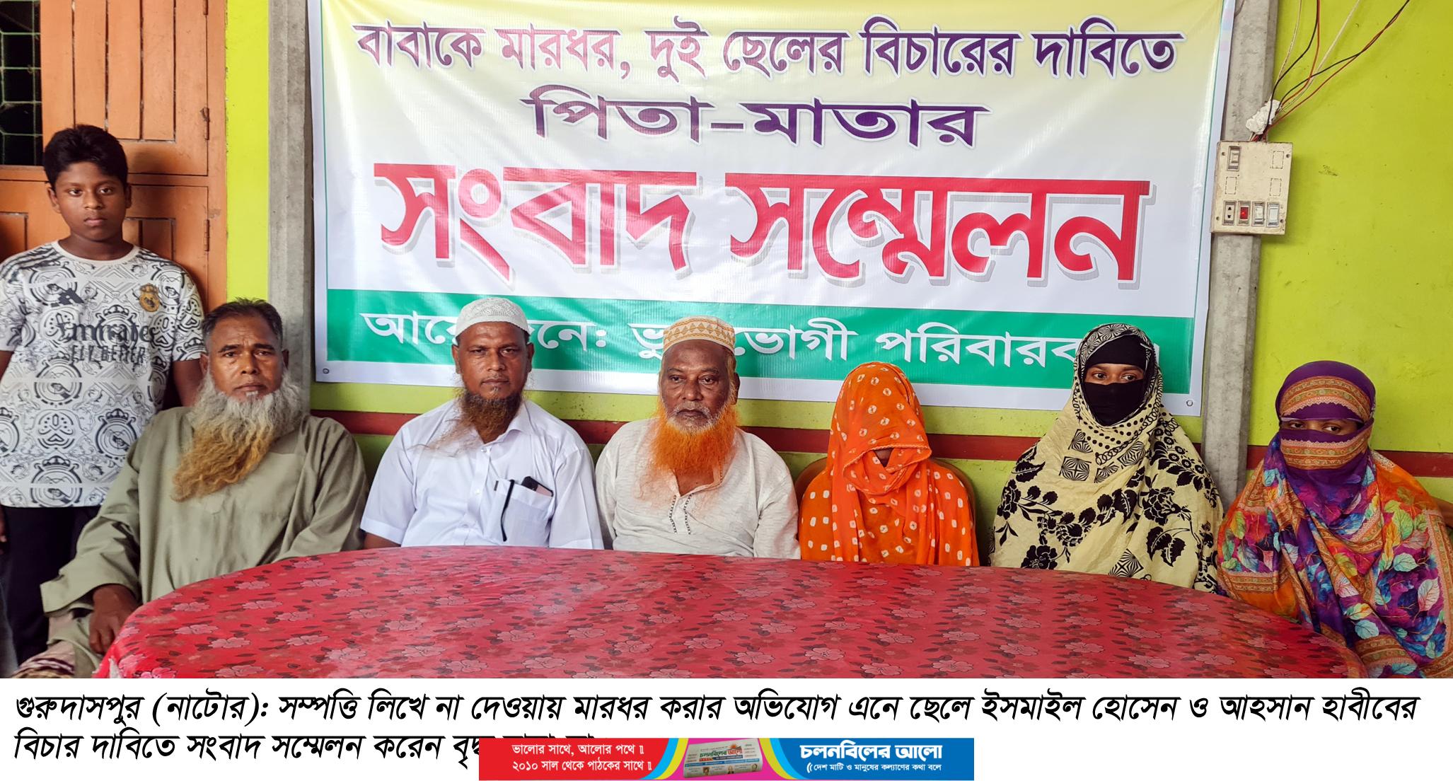 নাটোরের গুরুদাসপুরে সম্পত্তি লিখে না দেওয়ায় বৃদ্ধ বাবা-মাকে মারধর করার অভিযোগ উঠেছে ছেলে ইসমাইল হোসেন ও আহসান হাবীবের বিরুদ্ধে। রবিবার বেলা ১১টায় উপজেলার নাজিরপুর ইউনিয়নের বৃগড়িলা এলাকায় অভিযুক্তদের বিচার দাবিতে সংবাদ সম্মেলনে এসব অভিযোগ করেন তারা।