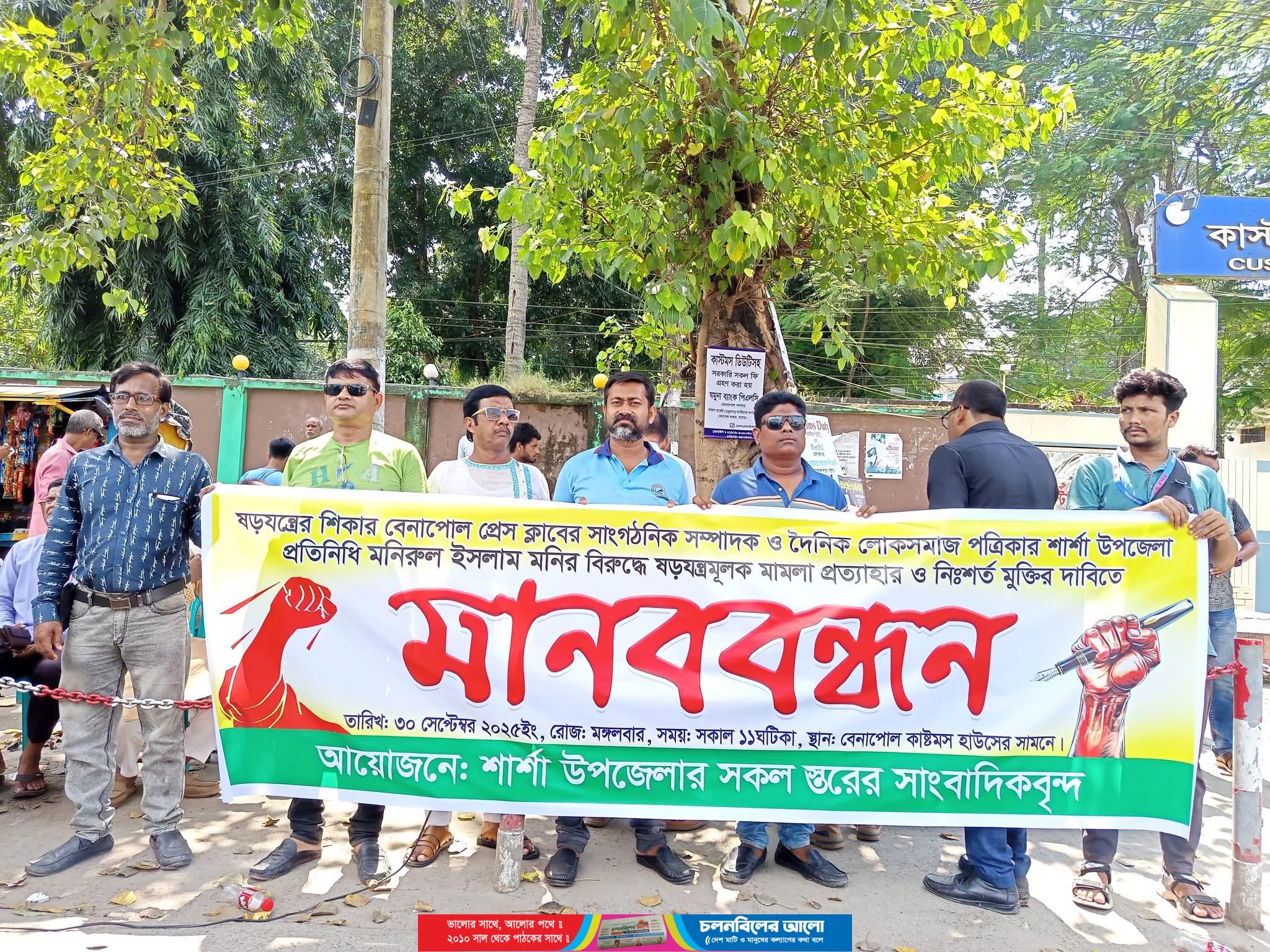 সাংবাদিক সমাজের আয়োজনে মঙ্গলবার (৩০ সেপ্টেম্বর) সকাল ১১টার সময় বেনাপোল কাস্টমস হাউজের সামনে ষড়যন্ত্র মুলক মিথ্যা মামলা প্রত্যাহার ও নি:শর্ত মুক্তির দাবিতে এ মানববন্ধন কর্মসুচী অনুষ্ঠিত হয়। ঘটনার ১৩ দিন পর মামলা করায় সন্দেহ হয়েছে মনিরকে এক শ্রেনীর কুচক্রী মহল রাজনৈতিক ও সাংবাদিক পেশার প্রতি প্রতিহিংসা পরায়ন হয়ে এ ন্যাক্কার জনকভাবে এ ঘটনা ঘটিয়েছে। এ মানববন্ধন কর্মসুচিতে প্রধান বক্তা হিসাবে উপস্থিত ছিলেন দৈনিক লোকসমাজ পত্রিকার ভারপ্রাপ্ত সম্পাদক আনোয়ারুল কবির নান্টু।