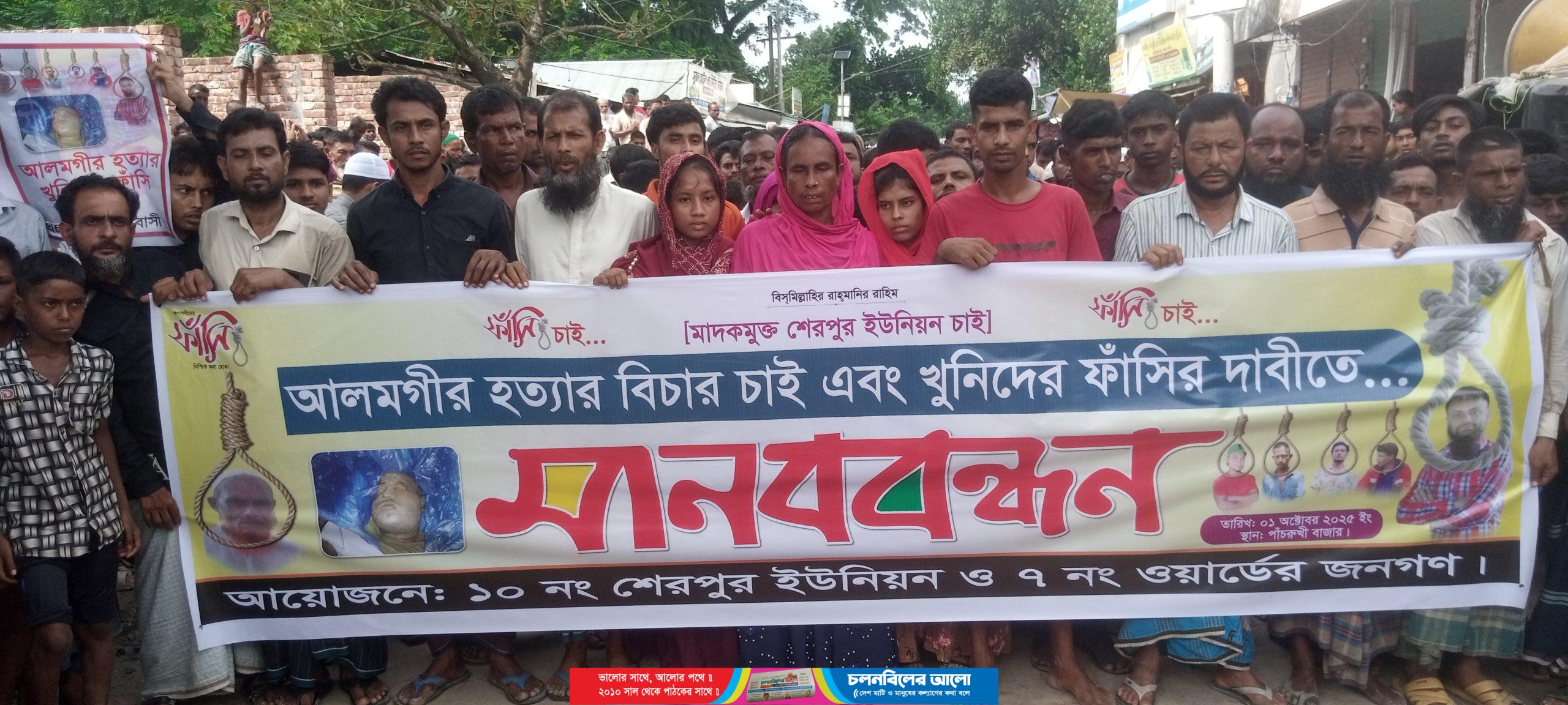 স্থানীয় এলাকাবাসীর আয়োজনে অনুষ্ঠিত মানববন্ধনে নানা শ্রেণি-পেশার মানুষ অংশগ্রহণ করেন। বক্তারা বলেন, আলমগীরকে নৃশংসভাবে হত্যা করে এলাকায় ভয়-ভীতি সৃষ্টি করা হয়েছে। এ ঘটনায় জড়িত আসামিদের এখনও আইনের আওতায় না আনা দুঃখজনক। দ্রুত বিচার কার্যক্রম সম্পন্ন করে হত্যাকারীদের ফাঁসির দণ্ড নিশ্চিত না হলে এলাকাবাসী কঠোর আন্দোলনে যেতে বাধ্য হবে বলে তারা হুঁশিয়ারি দেন।