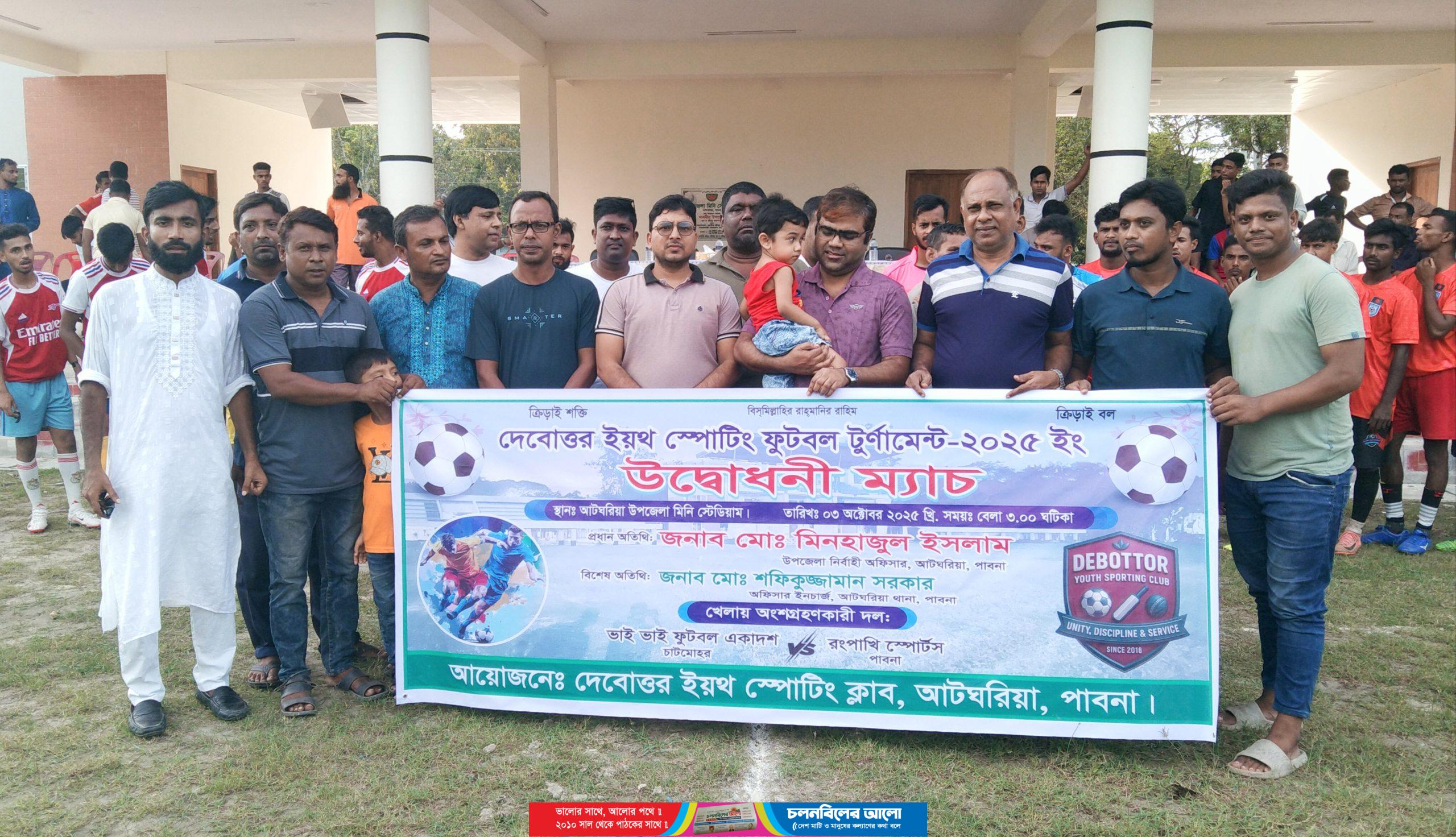 দেবোত্তর ইয়থ স্পোর্টিং ক্লাবের আয়োজন ফুটবল টুর্নামেন্ট ২০২৫ ইং শুভ উদ্বোধন অনুষ্ঠিত হয়েছে। আজ শুক্রবার ৩ অক্টোবর বিকেলে আটঘরিয়া উপজেলা মিনি স্টেডিয়ামে অনুষ্ঠিত ফুটবল টুর্নামেন্ট শুভ উদ্বোধন করেন উপজেলা নির্বাহী কর্মকর্তা মিনহাজুল ইসলাম।