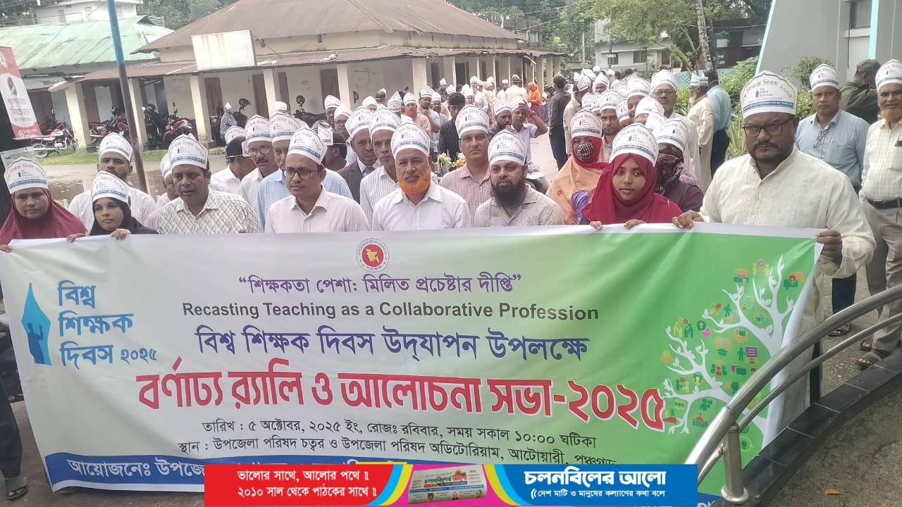 “ শিক্ষকতা পেশা মিলিত প্রচেষ্টার দীপ্তি ” এ প্রতিপাদ্যে বর্ণাঢ্য র‌্যালি ও আলোচনা সভার মধ্য দিয়ে বিশ্ব শিক্ষক দিবস উদযাপন করা হয়েছে। রবিবার ( ৫ অক্টোবর) উপজেলা প্রশাসন ও সম্মিলিত শিক্ষকবৃন্দের আয়োজনে বর্ণাঢ্য র‌্যালি ও আলোচনা সভা অনুষ্ঠিত হয়। দিবসটি উপলক্ষে সকালে  উপজেলা পরিষদ চত্বর থেকে ব্যান্ডপার্টি সহ একটি বর্ণাঢ্য র‌্যালি বের হয়ে উপজেলার গুরুত্বপূর্ণ সড়ক প্রদক্ষিণ করে আবার উপজেলা নির্বাহী অফিসারের কার্যালয়ের সামনে এসে শেষ হয়। পরে উপজেলা পরিষদ অডিটোরিয়ামে আলোচনা সভা অনুষ্ঠিত হয়। উপজেলা সহকারী মাধ্যমিক শিক্ষা অফিসার মোঃ জাহিদুল ইসলাম অনুষ্ঠানে সভাপতিত্ব করেন এবং স্বাগত বক্তব্য রাখেন। আটোয়ারী মডেল পাইলট উচ্চ বিদ্যালয়ের শরীরচর্চা শিক্ষক মোঃ জরিফ হোসেন চৌধুরী(মনি)’র সঞ্চালনায় প্রধান অতিথির বক্তব্য রাখেন উপজেলা নির্বাহী অফিসার মোঃ আরিফুজ্জামান। অন্যান্যদের মধ্যে বক্তব্য রাখেন, উপজেলা একাডেমিক সুপারভাইজার মোঃ রেজাউন নবী রাজা, ডাঙ্গীর হাট সরকারি কলেজের অধ্যক্ষ মোঃ নাসির উদ্দীন, আটোয়ারী আদর্শ মহিলা ডিগ্রি কলেজের অধ্যক্ষ (ভারপ্রাপ্ত) মোঃ মজলুন ইসলাম(নয়ন), আটোয়ারী মডেল পাইলট উচ্চ বিদ্যালয়ের প্রধান শিক্ষক মোঃ আব্দুল কুদ্দুশ, মির্জাপুর মাওলানা আজিমউদ্দীন আলিম মাদরাসার অধ্যক্ষ মোঃ আব্দুল মান্নান,মির্জাপুর উচ্চ বিদ্যালয়ের প্রধান শিক্ষক পরিমল চন্দ্র চট্রপাধ্যায়, আটোয়ারী মডেল সরকারি প্রাথমিক বিদ্যালয়ের প্রধান শিক্ষক মোঃ রেজা আল মামুন, তোড়িয়া আদর্শ বালিকা উচ্চ বিদ্যালয়ের প্রধান শিক্ষক মোঃ তরিকুল ইসলাম প্রমুখ। সভায় বক্তারা বলেন, একটি দেশের উন্নয়ন ও অগ্রগতির ভিত্তি হচ্ছে মানসম্পন্ন শিক্ষা, আর সেই শিক্ষার মূল চালিকা শক্তি শিক্ষক সমাজ। শিক্ষার গুণগত মান বৃদ্ধি ও সুশিক্ষিত প্রজন্ম গড়ে তুলতে সবাইকে একসাথে কাজ করতে হবে।