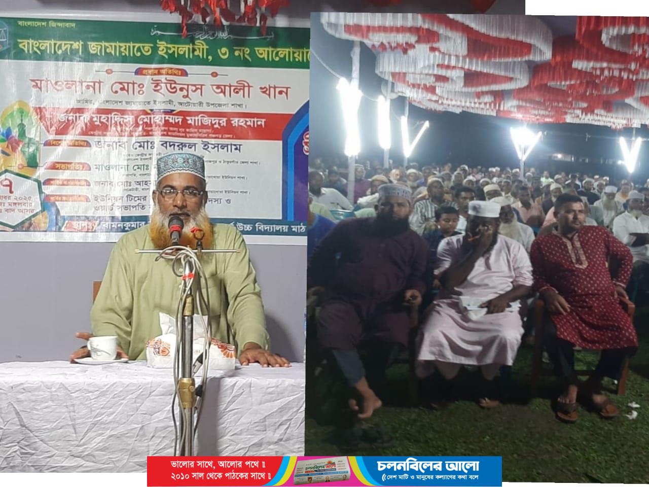 পঞ্চগড়ের আটোয়ারীতে মহানবী হযরত মুহাম্মদ(সা.)-এর জীবনাদর্শ তুলে ধরার লক্ষ্যে সিরাতুন্নবী(সা.) মাহফিল অনুষ্ঠিত হয়েছে। বাংলাদেশ জামায়াতে ইসলামী ৩নং আলোয়াখোয়া ইউনিয়নের উদ্যোগে মঙ্গলবার (৭ অক্টোবর) বাদ মাগরিব উপজেলার রাখালদেবী আদর্শ উচ্চ বিদ্যালয় মাঠে এ মাহফিলের আয়োজন করা হয়। মাহফিলে সভাপতিত্ব করেন জামায়াতে ইসলামী’র আলোয়াখোয়া ইউনিয়ন সভাপতি মাওলানা মাইনুদ্দীন। আলোয়াখোয়া ইউনিয়ন জামায়াতের সেক্রেটারী মোঃ আহসান হাবিব-এর সঞ্চালনায় মাহফিলে প্রধান মুফাস্সির হিসেবে তাফ্সীর পেশ করেন পঞ্চগড় নুরুল আলা নূর কামিল মাদরাসার অধ্যাপক ও মাজলিসুল মুফাস্সেরিন পঞ্চগড় জেলা সভাপতি মুহাদ্দিস মুহাম্মদ মাজিদুর রহমান। মাহফিলে প্রধান অতিথি হিসেবে সিরাতুন্নবী (সা.)এর তাৎপর্য আলোচনা করেন,বাংলাদেশ জামায়াতে ইসলামী,আটোয়ারী উপজেলা শাখার আমীর মাওলানা মোঃ ইউনুস আলী খাঁন। বিশেষ অতিথি হিসেবে আলোচনা করেন বাংলাদেশ ইসলামী ছাত্র শিবিরের কেন্দ্রিয় কার্যকরী পরিষদের সাবেক সদস্য ও রংপুর মহানগর শিবিরের সাবেক সভাপতি ছাত্র নেতা মোঃ বদরুল ইসলাম। অন্যান্যদের মধ্যে বক্তব্য রাখেন, মাওঃ সোহরাব হায়দার কাদেরী, মাওঃ সাদেকুল ইসলাম, মাওঃ জয়নুল আবেদিন, মাওঃ হাসিনুর রহমান প্রমুখ।