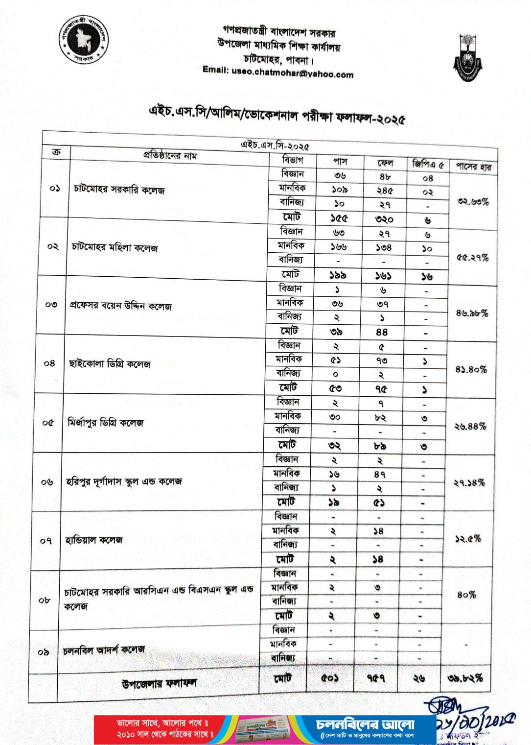 ২০২৫ সালের এইচএসসি ও সমমান পরীক্ষার ফলাফল প্রকাশিত হয়েছে। এবারের পরীক্ষায় পাবনার চাটমোহর উপজেলার সাধারণ (জেনারেল), ব্যবসায় ব্যবস্থাপনা (বিএম) ও আলিম—এই তিন শাখায় মোট ২ হাজার ১৫৫ জন পরীক্ষার্থী অংশ নেয়।