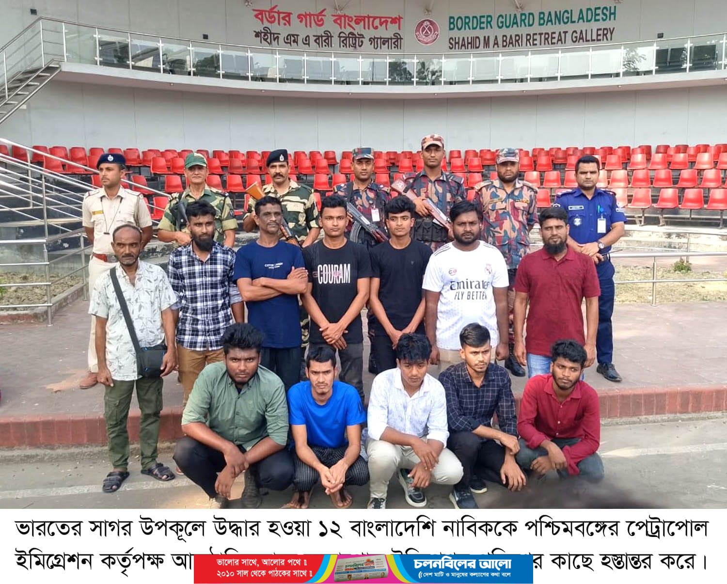 ভারতের সাগর উপকূলে উদ্ধার হওয়া ১২ জন বাংলাদেশি নাবিক দীর্ঘ আট মাস পর দেশে ফিরেছেন। শনিবার (১৮ অক্টোবর) বিকেলে বিশেষ ট্রাভেল পারমিটের মাধ্যমে ভারতের পেট্রাপোল ইমিগ্রেশন কর্তৃপক্ষ আনুষ্ঠানিকভাবে তাঁদেরকে বাংলাদেশের বেনাপোল চেকপোস্ট ইমিগ্রেশন পুলিশের কাছে হস্তান্তর করে।