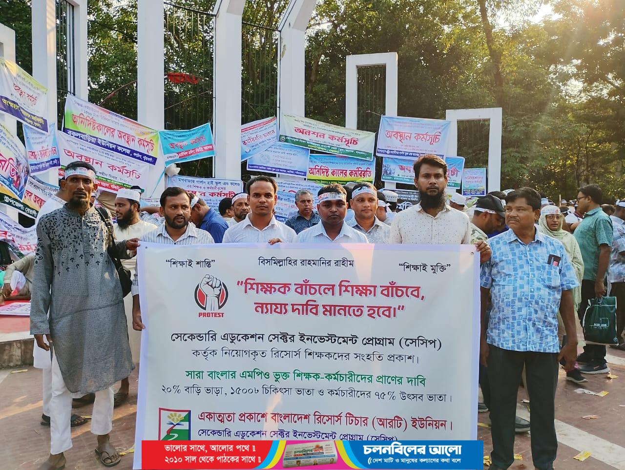 এমপিওভুক্ত শিক্ষা জাতীয়করণ প্রত্যাশী জোট এর আহবানে আয়োজিত শিক্ষকদের তিন দফা দাবি বাস্তবায়নের আন্দোলনে সংহতি প্রকাশ করেছেন মাধ্যমিক ও উচ্চ শিক্ষা অধিদপ্তরের অধীনে পরিচালিত সেসিপ প্রকল্পের রিসোর্স শিক্ষকবৃন্দ।