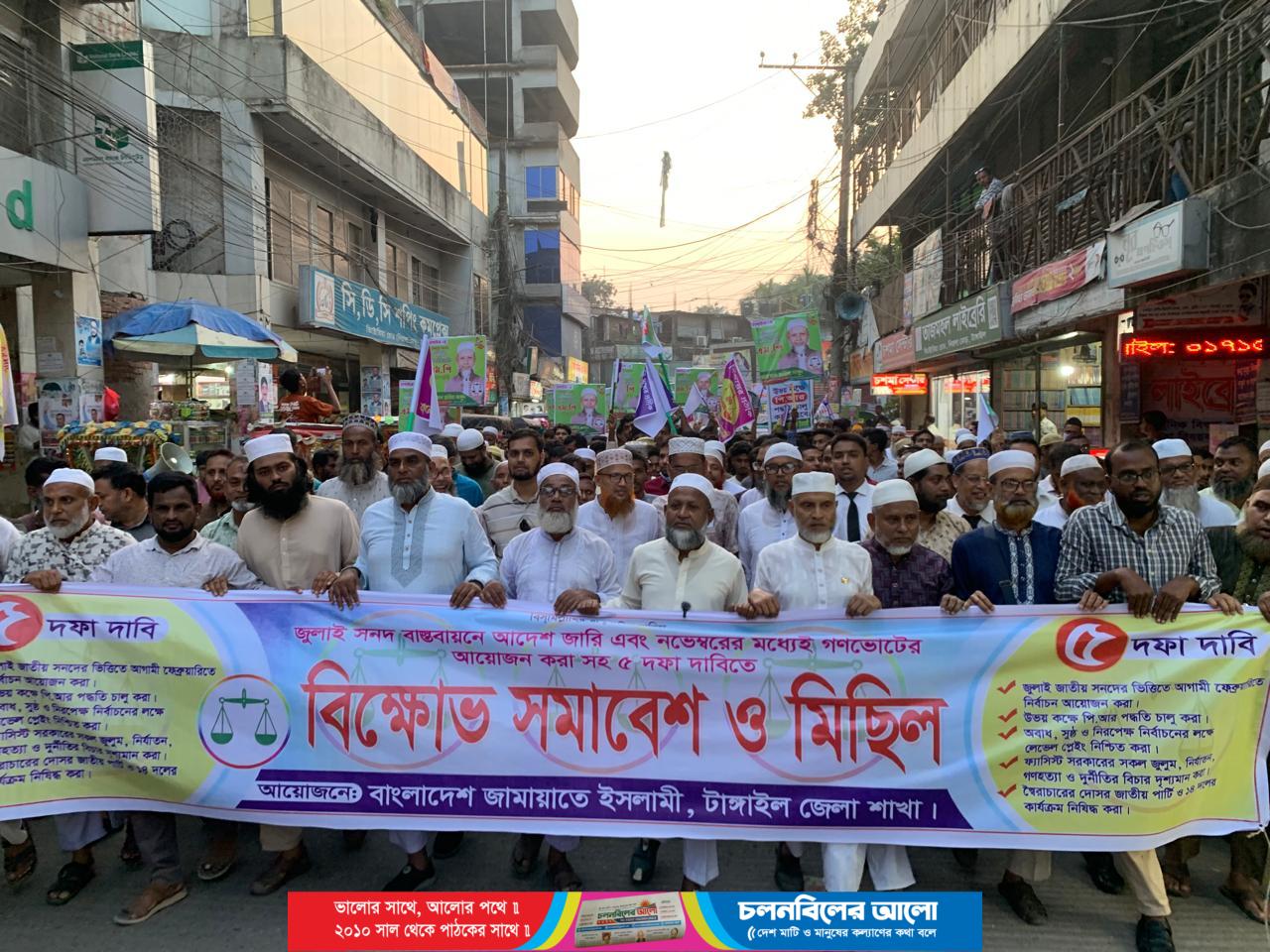 জুলাই সনদ বাস্তবায়নে আদেশ জারি এবং নভেম্বরের মধ্যেই গণভোটের আয়োজনসহ ৫ দফা দাবিতে টাঙ্গাইলে বিক্ষোভ সমাবেশ ও মিছিল  করেছে।জামায়াতে ইসলামী টাংগাইল জেলা।