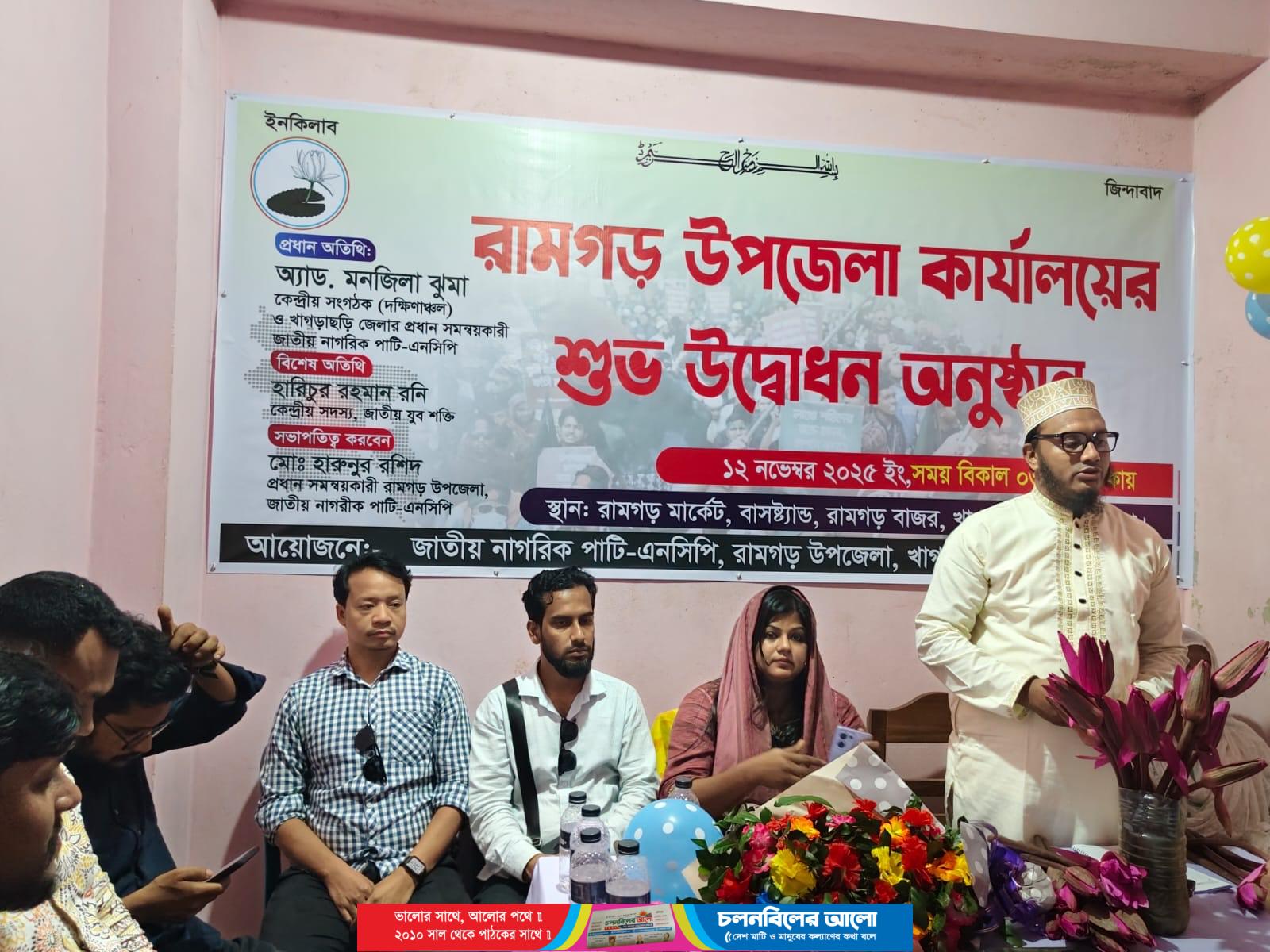 উদ্দীপনামুখর পরিবেশে খাগড়াছড়ির রামগড়ে উদ্বোধন হয়েছে জাতীয় নাগরিক পার্টির (এনসিপি) উপজেলা কার্যালয়।আজ বুধবার (১২ নভেম্বর ২০২৫) বিকেলে রামগড় বাজারের বাসস্ট্যান্ড এলাকায় আয়োজিত অনুষ্ঠানে দলীয় নেতাকর্মী ও স্থানীয় গণ্যমান্য ব্যক্তিরা উপস্থিত ছিলেন।