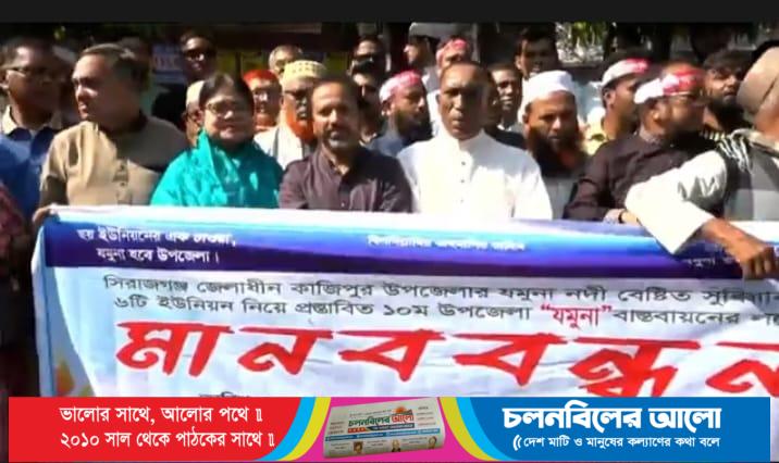 সিরাজগঞ্জে ‘যমুনা’ নামে উপজেলা চায় চরাঞ্চলের ৬ ইউনিয়নবাসী। সিরাজগঞ্জের কাজীপুরে যমুনা নদীর চরাঞ্চলের ৬ টি ইউনিয়ন নিয়ে ‘যমুনা’ নামে নতুন উপজেলা গঠনের দাবিতে মানববন্ধন অনুষ্ঠিত হয়েছে।