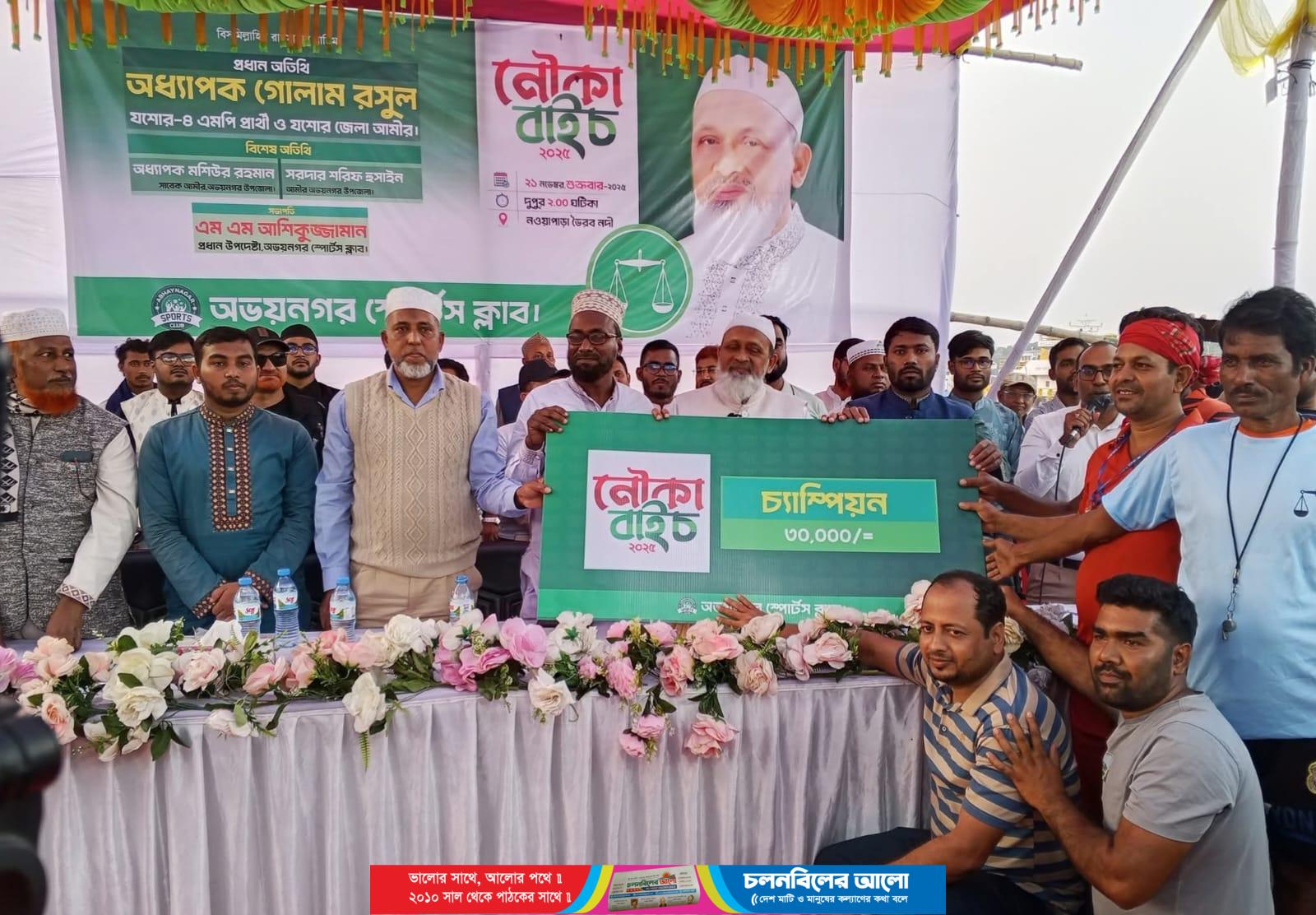 যশোরের অভয়নগর উপজেলার নওয়াপাড়ার প্রাণকেন্দ্র ভৈরব নদীতে শুক্রবার (২১ নভেম্বর) অনুষ্ঠিত হলো বর্ণিল ও ঐতিহ্যমণ্ডিত নৌকা বাইচ প্রতিযোগিতা। দুপুর থেকেই তালতলা খেয়াঘাট থেকে নওয়াপাড়া ফেরিঘাট পর্যন্ত নদীপথজুড়ে উৎসবের আমেজ ছড়িয়ে পড়ে। ঢাক-ঢোলের তালে, পল্লিগীতির সুরে আর মাঝিদের উচ্ছ্বাসে হাজারো মানুষের সমাগমে নদীর দুই তীর পরিণত হয় লোকজ মিলনমেলায়। দুপুর ২টায় প্রতিযোগিতার উদ্বোধন করেন যশোর জেলা জামায়াতে ইসলামী আমীর ও যশোর-৪ আসনের মনোনীত সংসদ সদস্য পদপ্রার্থী অধ্যাপক গোলাম রসুল। বিশেষ অতিথি হিসেবে উপস্থিত ছিলেন অভয়নগর উপজেলা জামায়াতের সাবেক আমীর ও জেলা শূরা সদস্য মশিউর রহমান এবং উপজেলা আমীর সর্দার শরীফ হোসেন।