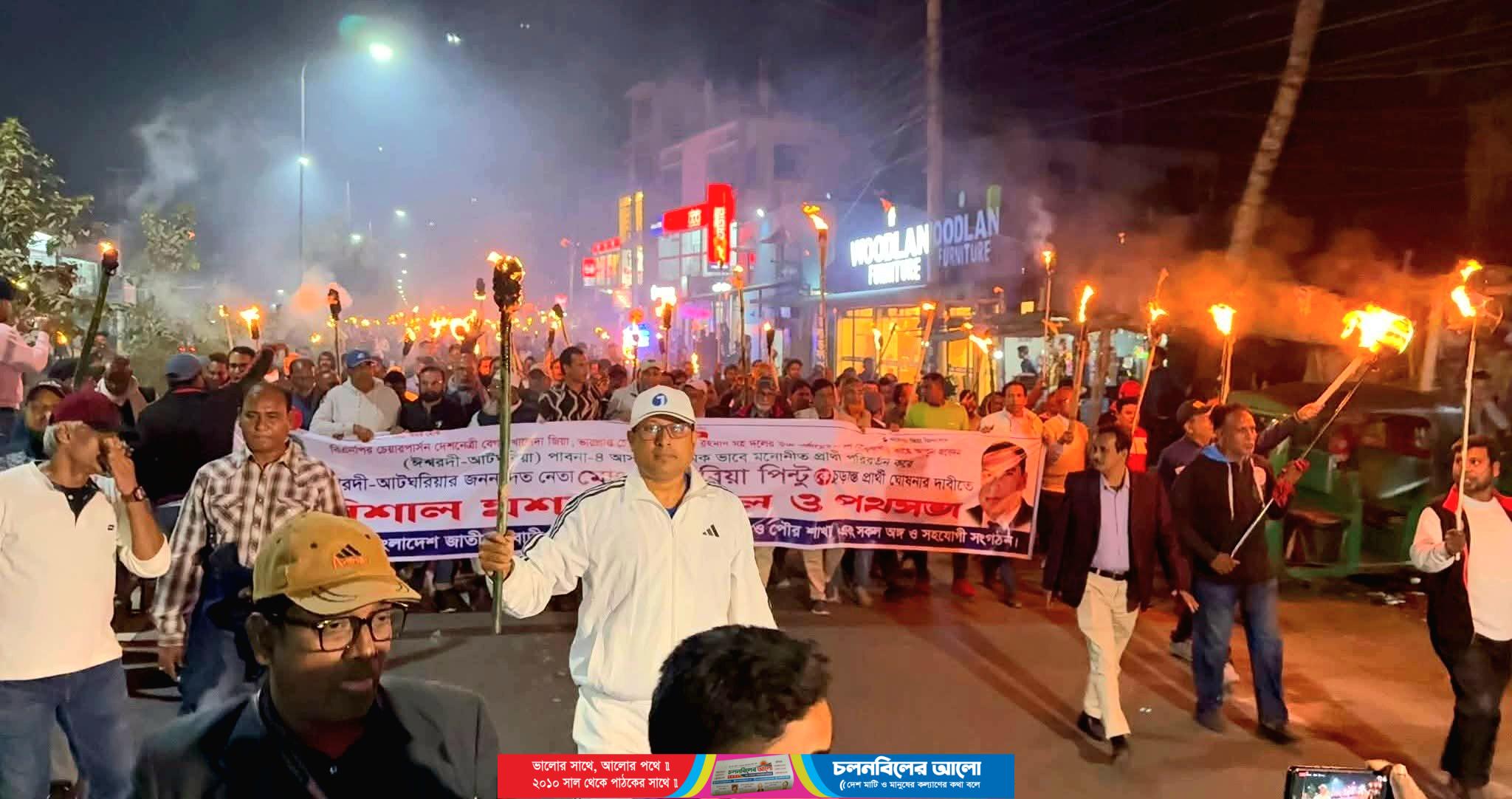 পাবনা-৪ (ঈশ্বরদী–আটঘরিয়া) আসনে বিএনপি চেয়ারপারর্সনের উপদেষ্টা ও পাবনা জেলা বিএনপির আহবায়ক হাবিবুর রহমান হাবিবের মনোনয়ন বাতিল করে জেলা বিএনপির সাবেক যুগ্ম সম্পাদক ও পৌর বিএনপির সাবেক সাধারণ সম্পাদক জাকারিয়া পিন্টুকে মনোনয়ন দেওয়ার দাবিতে ঈশ্বরদীতে বিশাল মশাল মিছিল করেছেন দলের নেতাকর্মীরা। সোমবার (২৪ নভেম্বর) সন্ধ্যা সাড়ে সাতটার সময় শহরের আলহাজ্ব মোড় থেকে এই বিশাল মশাল মিছিলটি শুরু করেন তারা। সেখান থেকে মিছিলটি শহরের প্রধান প্রধান সড়ক প্রদক্ষিণ শেষে রেলগেট কেন্দ্রীয় শহীদ মিনার চত্বরে এসে পথসমাবেশে রূপ নেয়। এসময় বক্তারা জাকারিয়া পিন্টুকে দলের যোগ্য প্রার্থী হিসেবে বিবেচনা করে তাকে চূড়ান্ত মনোনয়ন দেওয়ার জোর দাবি জানানো হয়েছে। উপজেলা বিএনপির সাবেক সভাপতি শামসুদ্দিন আহমেদ মালিথা বক্তব্য বলেন, “দলের যোগ্য ও জনপ্রিয় নেতৃত্ব হিসেবে জাকারিয়া পিন্টুই এই আসনের উপযুক্ত প্রার্থী। পৌর বিএনপির সাবেক যুগ্ম সম্পাদক এস এম ফজলুর রহমান বক্তব্য বলেন, আমরা সুখ এবং দুঃখে দিনে যাকে সবসময় পাশে পাই সে মোদের জাকারিয়া পিন্টু ভাই।পথসভায় উপস্থিত ছিলেন, আটঘরিয়া উপজেলা বিএনপির সাবেক সদস্য সচিব ফারুক আহমেদ, ঈশ্বরদী পৌর যুবদলের আহ্বায়ক জাকির হোসেন জুয়েল, পৌর বিএনপির সাবেক যুগ্ম সম্পাদক আতাউর রহমান পাতা, পৌর বিএনপির সাবেক নেতা আমিনুল ইসলাম স্বপন, পৌর বিএনপির সাবেক সাংগঠনিক সম্পাদক ইসলাম হোসেন জুয়েল, ঈশ্বরদী পৌরসভার সাবেক কাউন্সিলর আনোয়ার হোসেন জনি, বিএনপি নেতা জাহাঙ্গীর হোসেন, আখতারুজ্জামান, আক্কাস মেম্বার, টুটুল সরদার, আবু বকর সিদ্দিক বেল্টু, আবু সাঈদ লিটন, উপজেলা যুবদলের যুগ্ন আহবায়ক হীরক সরদার, ঈশ্বরদী শিল্প ও বনিক সমিতির সভাপতি আশিকুর রহমান নান্নু,পৌর ষুবদলের সাবেক সভাপতি মোস্তফা নূরে আলম শ্যামল, পৌর সেচ্ছাসেবক দলের আহ্বায়ক মামুনুর রশিদ নান্টু, পৌর স্বেচ্ছাসেবক দলের সদস্য সচিব মাহমুদুর রহমান ফুল জুয়েল, পৌর ছাত্রদলের সাবেক সভাপতি খন্দকার তৌফিক আলম সোহেল, পৌর যুবদলের সাবেক সভাপতি আক্তার হোসেন নিফা, বিএনপি নেতা খোরশেদ আলম দিপু, বিএনপি নেতা খোরশেদ আলম, উপজেলা যুবদলের যুগ্ম আহ্বায়ক মাহমুদুল হাসান সোনা মনি, পৌর ৭নং ওয়ার্ড যুবদলের সভাপতি রিংকু শেখ, পৌর মহিলাদলের নেত্রী শামীমা আক্তার সাথীসহ সকল পর্যায়ের নেতৃবৃন্দ এসময় উপস্থিত ছিলেন। বক্তারা ঘোষণা করেন, জাকারিয়া পিন্টুকে মনোনয়ন না দেওয়া পর্যন্ত তাদের আন্দোলন অব্যাহত থাকবে। উল্লেখ্য, গত ৩ নভেম্বর পাবনা জেলা বিএনপির আহ্বায়ক হাবিবুর রহমান হাবিবকে দলীয় প্রার্থী হিসেবে মনোনয়ন দেওয়া হয়। এরপর থেকেই জাকারিয়া পিন্টুর সমর্থকেরা মনোনয়ন পরিবর্তনের দাবিতে বিভিন্