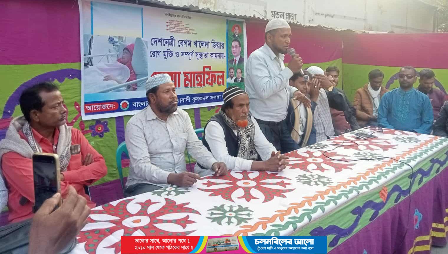 আজ শনিবার বিকেল সাড়ে ৪ টায় সলঙ্গা থানা সদর গরু হাটা মাঠ প্রাঙ্গনে থানা কৃষকদলের আয়োজনে এ দোয়া মাহফিল অনুষ্ঠিত হয়। রেজাউল করিম রেজার সভাপতিত্বে ও আব্দুস সোবাহানের সঞ্চালনায় দোয়া মাহফিলে প্রধান অতিথি হিসেবে উপস্থিত ছিলেন, সলঙ্গা থানা বিএনপির সাবেক সভাপতি মতিয়ার রহমান সরকার।অন্যান্যের মধ্যে আরও উপস্থিত ছিলেন,সলঙ্গা থানা কৃষকদলের সিনিয়র সহ-সভাপতি সুরুত জামান তালুকদার,থানা যুবদলের সিনিয়র যুগ্ম আহ্বায়ক রফিকুল ইসলাম রফিক,সলঙ্গা ইউনিয়ন বিএনপির সহ-সভাপতি শামসুল আলম,থানা কৃষকদলের যুগ্ম সাধারণ সম্পাদক ইব্রাহিম হোসেন,জুয়েল রানা,আল-আমিন ও মাসুদ রানা,থানা কৃষকদলের সহ-সভাপতি,রফিকুল ইসলাম লিটন,থানা জিয়া পরিষদের সভাপতি হিলটন খন্দকার ও সাধারণ সম্পাদক নজরুল মাষ্টার,থানা কৃষকদলের দপ্তর সম্পাদক ছানোয়ার হোসেন,থানা ছাত্রদলের আহ্বায়ক হারুনর রশীদ হিরন,থানা কৃষকদলের যোগাযোগ বিষয়ক সম্পাদক আশরাফুল ইসলাম,শাহাদত,খায়রুল ইসলাম প্রমুখ।পরে সাবেক প্রধানমন্ত্রী,দেশনেত্রী বেগম খালেদা জিয়ার দ্রুত সুস্থতা ও দীর্ঘায়ু কামনায় বিশেষ মোনাজাত করা হয়।