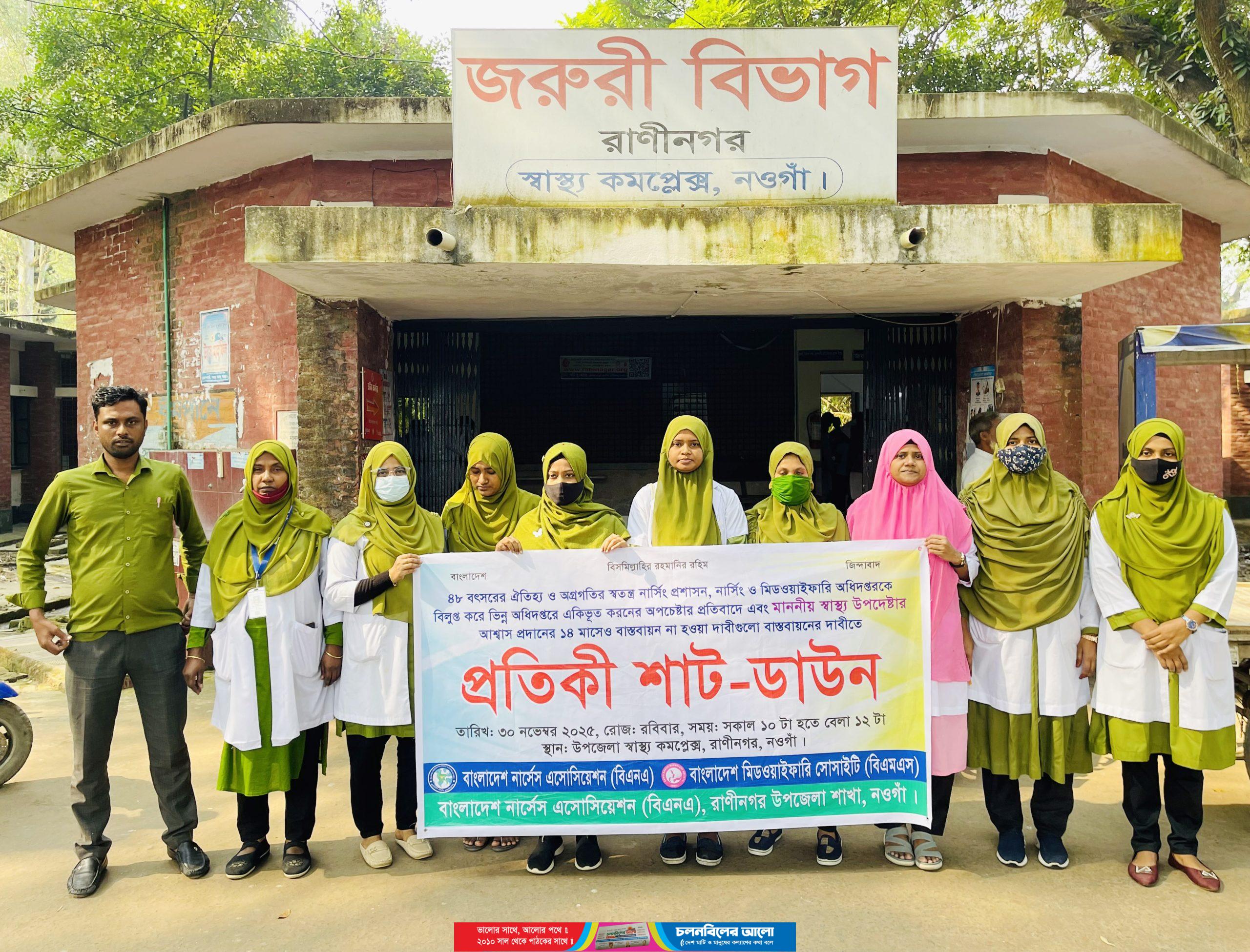 রাণীনগরে ৮দফা দাবিতে নার্সদের প্রতিকী শাট-ডাউন কর্মসূচি অনুষ্ঠিত