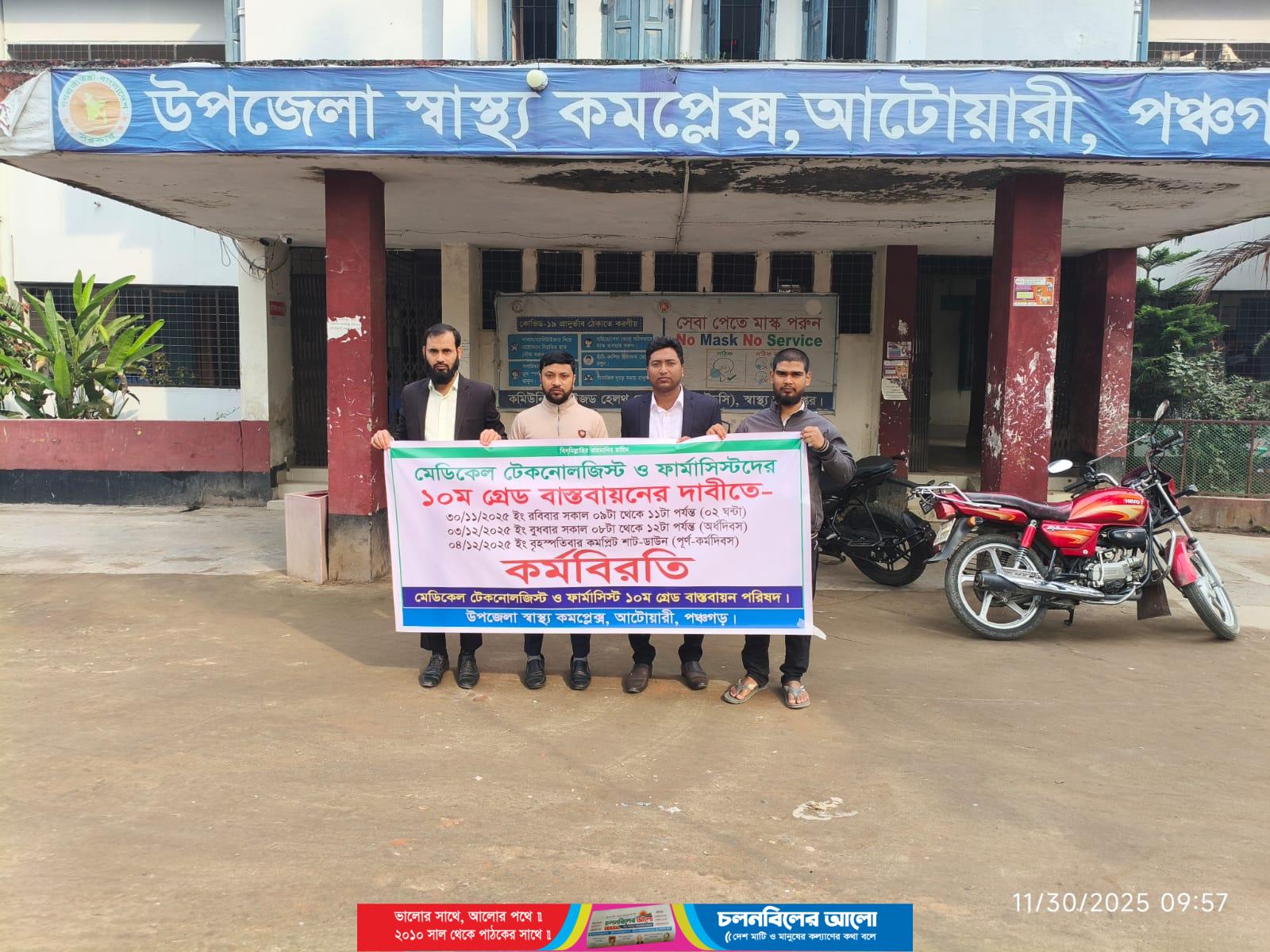 বেতন বৈষম্যের অবসান চেয়ে ডিপ্লোমাধারী মেডিকেল টেকনোলজিস্ট ও ফার্মাসিস্টদের পদমর্যাদা ১১তম গ্রেড থেকে ১০ম গ্রেডে বাস্তবায়নের দাবীতে পঞ্চগড়ের আটোয়ারীতে কর্মবিরতি পালিত হয়েছে। কেন্দ্রিয় কর্মসূচি অনুয়ায়ী রবিবার (৩০ নভেম্বর) সকাল ৯টা থেকে সকাল ১১টা পর্যন্ত দুই ঘন্টাব্যাপি আটোয়ারী উপজেলা স্বাস্থ্য কমপ্লেক্সের সামনে মেডিকেল টেকনোলজিস্ট ও ফার্মাসিস্টরা এই কর্মবিরতি পালন করেন।