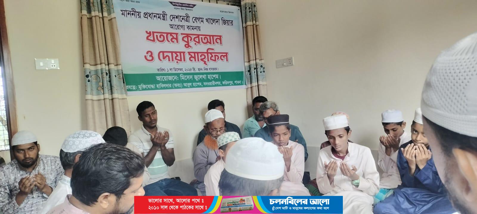 পাবনার ফরিদপুর উপজেলায় এক মহীয়সী নারীর মানবিক ও ধর্মীয় অনুপ্রেরণা থেকে দেশের সাবেক প্রধানমন্ত্রী এবং বিএনপি চেয়ারপারসন বেগম খালেদা জিয়ার রোগমুক্তি কামনায় খতমে কুরআন ও দোয়া মাহফিল অনুষ্ঠিত হয়েছে।