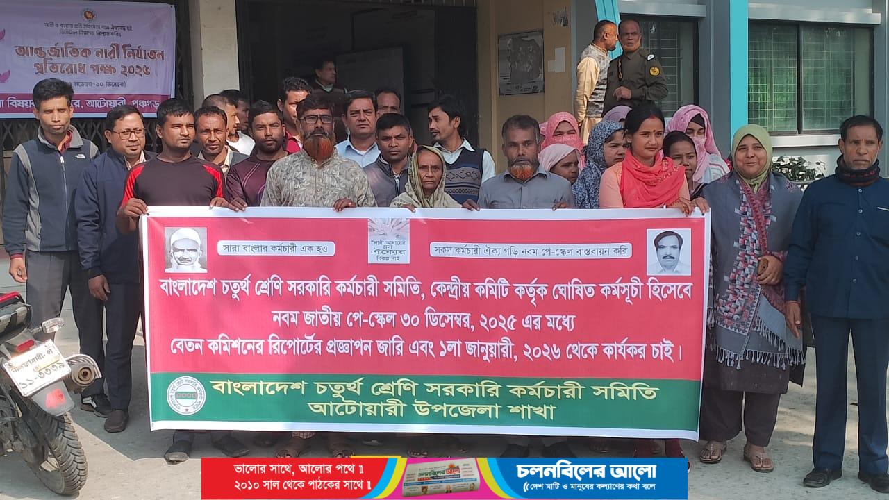 “ সকল কর্মচারী ঐক্য গড়ি, নবম পে-স্কেল বাস্তবায়ন করি ” শ্লোগান নিয়ে সরকারি কর্মচারীদের বেতন বৈষম্য দূরীকরণ ও ৯ম পে-স্কেল বাস্তবায়নের দাবিতে মঙ্গলবার ( ২ ডিসেম্বর) সকালে পঞ্চগড়ের আটোয়ারীতে বিক্ষোভ কর্মসূচি পালন করা হয়েছে। বাংলাদেশ চতুর্থ শ্রেণি সরকারি কর্মচারী সমিতি, আটোয়ারী উপজেলা শাখার আয়োজনে করা এই কর্মসূচি উপজেলা পরিষদ চত্বরে পালন করা হয়। কর্মসূচিতে অংশ নেওয়া কর্মচারীরা শান্তিপূর্ণভাবে তাদের দাবিগুলো বক্তব্যের মাধ্যমে তুলে ধরেন। তারা সরকারের কাছে বৈষম্যমুক্ত ৯ম পে-স্কেলের গেজেট জারি ও ৫ দফা দাবির বাস্তবায়ন চেয়ে বক্তব্য দেন। কর্মচারীরা জানান, দীর্ঘদিন ধরে তারা বৈষম্যমুক্ত বেতন কাঠামোর দাবি জানিয়ে আসছেন। কিন্তু এখনো সেই দাবি বাস্তবায়ন না হওয়ায় তারা বাধ্য হয়ে আন্দোলনে নেমেছেন। তাদের বক্তব্য, নবম জাতীয় পে-স্কেল ৩০ ডিসেম্বর ২০২৫ এর মধ্যে বেতন কমিশনের রিপোর্টের প্রজ্ঞাপন জারি এবং ১লা জানুয়ারি ২০২৬ থেকে কার্যকর করতে হবে। দাবি পূরণ না হলে কেন্দ্রিয় কমিটির সিদ্ধান্ত মোতাবেক বৃহৎ আকারের কর্মসূচি গ্রহণ করা হবে। বাংলাদেশ চতুর্থ শ্রেণি সরকারি কর্মচারী সমিতি আটোয়ারী উপজেলা শাখার সভাপতি মোঃ আনারুল ইসলামের নেতৃত্বে এলজিইডি’র চতুর্থ শ্রেণি কর্মচারী মোঃ বসির উদ্দীন, ইউএনও অফিসের কর্মচারী মিনাল চন্দ্র মদক, নারায়ন চন্দ্র ঘোষসহ কর্মসূচিতে উপজেলার বিভিন্ন দপ্তরের তৃতীয় ও চতুর্থ শ্রেণির সরকারি কর্মচারীবৃন্দ উপস্থিত ছিলেন।