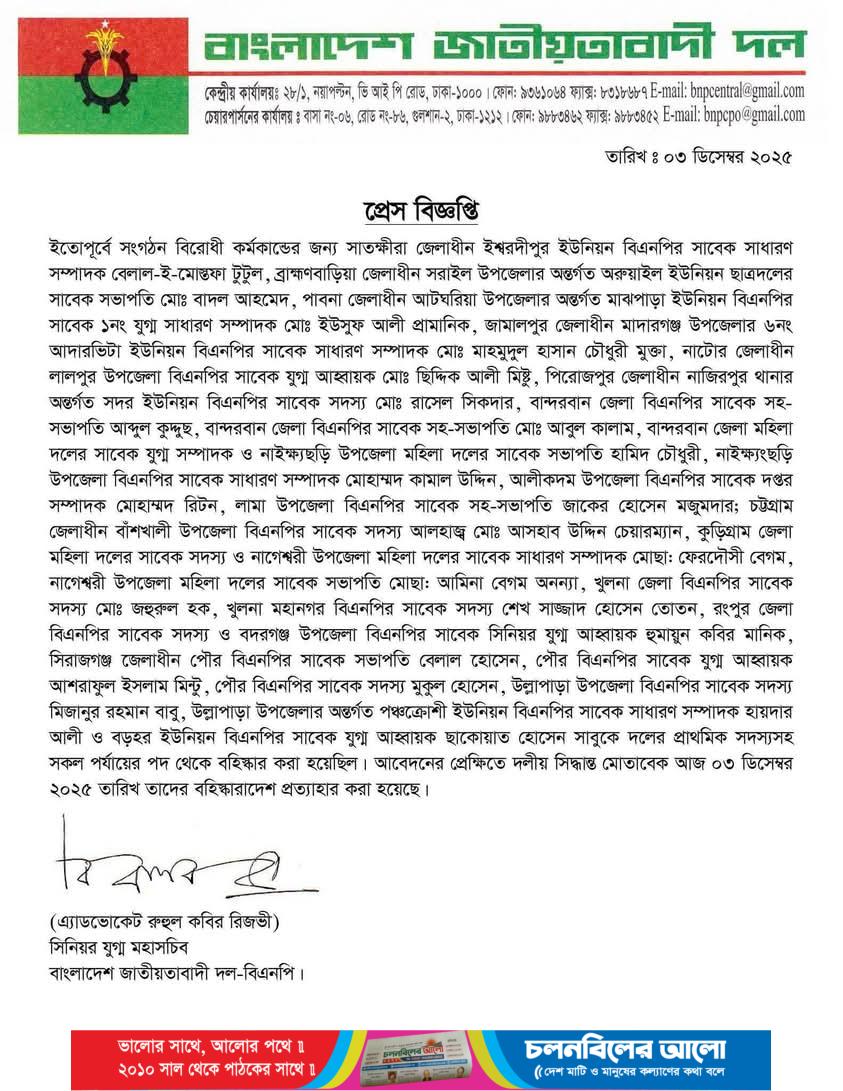 বিজ্ঞপ্তিতে জানানো হয়, সংগঠন বিরোধী কর্মকাণ্ডের জন্য বান্দরবানের এই নেতা কর্মীসহ বিভিন্ন জেলার আরও কয়েকজন নেতা-কর্মীদের সব পর্যায়ের পদ থেকে বহিষ্কার করা হয়েছিল। তাদের আবেদনের প্রেক্ষিতে দলীয় সিদ্ধান্ত মোতাবেক আজ ৩ ডিসেম্বর২০২৫ হতে তাদের বহিষ্কারাদেশ প্রত্যাহার করা হয়েছে।