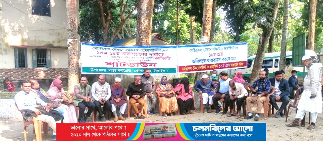 টাঙ্গাইলের গোপালপুর উপজেলা স্বাস্থ্য কমপ্লেক্সে ন্যায্য ১০ম গ্রেড বাস্তবায়নের দাবিতে কর্মবিরতি পালন করছেন মেডিকেল টেকনোলজিস্ট ও ফার্মাসিস্টরা। (৪ ডিসেম্বর) বৃহস্পতিবার সকাল থেকে তারা একত্রিত হয়ে শান্তিপূর্ণভাবে অবস্থান কর্মসূচি পালন করছেন।