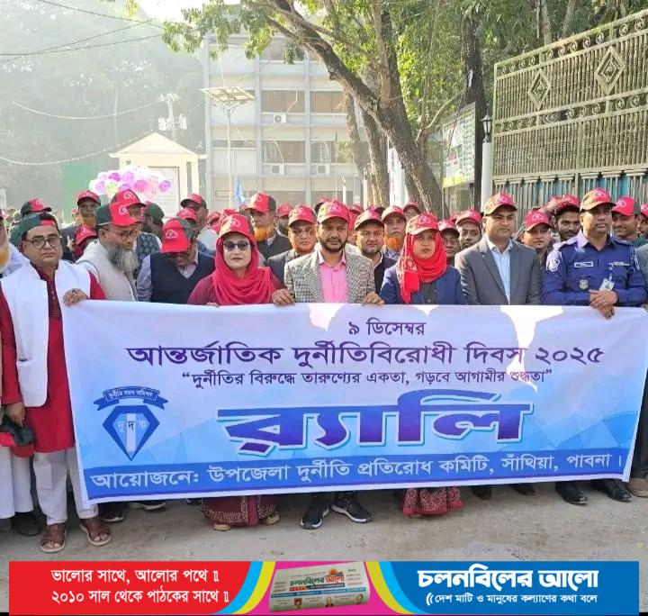 পাবনা সাঁথিয়ায় অন্তর্জাতিক দুর্নীতিবিরোধী দিবস পালিত হয়েছে। আজ (মঙ্গলবার ০৯ ডিসেম্বর) সকাল ১১ টার দিকে সাঁথিয়া উপজেলা চত্তর থেকে একটি র্যালি বের হয়ে পৌর সদরের প্রধান প্রধান সড়ক প্রদক্ষিন করে শেষ হয়।