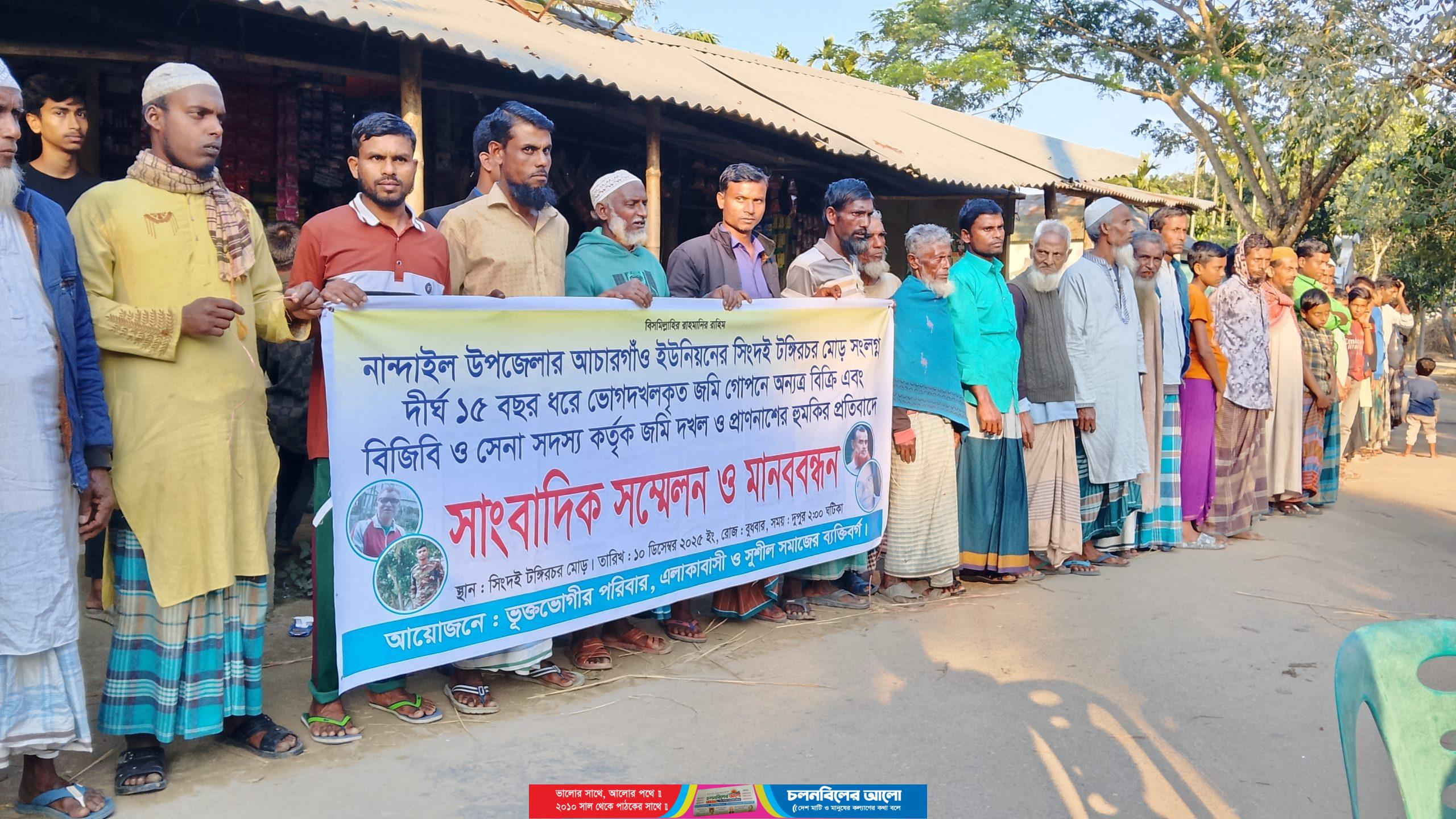 ময়মনসিংহের নান্দাইল উপজেলার আচারগাঁও ইউনিয়নের সিংদই টঙ্গিরচর মোড় সংলগ্ন দীর্ঘ ১৫ বছর ধরে ভোগদখলকৃত জমি গোপনে অন্যত্র বিক্রি এবং সরকারি চাকরিজিবী কর্তৃক জমি দখল ও প্রাণনাশের হুমকির অভিযোগে সংবাদ সম্মেলন ও মানববন্ধন অনুষ্ঠিত হয়েছে। বুধবার (১০ ডিসেম্বর ২০২৫) দুপুর ২টায় সিংদই টঙ্গিরচর মোড়ে ভূক্তভোগী পরিবার, এলাকাবাসী ও সুশীল সমাজের ব্যক্তিবর্গের আয়োজনে এই কর্মসূচি অনুষ্ঠিত হয়।