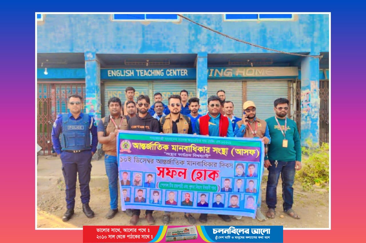 বিশ্ব আন্তর্জাতিক মানবাধিকার দিবস উপলক্ষে রাজশাহী ও খুলনা বিভাগীয় কমিটি ঈশ্বরদী শাখার উদ্যোগে আন্তর্জাতিক মানবাধিকার সংস্থা ও আইন সহায়তা ফাউন্ডেশনের পক্ষ থেকে ৭৭তম প্রতিষ্ঠাবার্ষিকীর আয়োজন করা হয়েছে। আজ বুধবার (১০ ডিসেম্বর) সকাল ৯টার সময় বিশাল র্যালি ও শোভাযাত্রার মধ্য দিয়ে দিবসটি পালন করা হয়েছে। ঈশ্বরদী সরকারি কলেজ রোডস্থ বকুলের মোড় থেকে র্যালি ও শোভাযাত্রাটি বের করে শহরের প্রধান প্রধান সড়ক প্রদক্ষিণ শেষে ঈশ্বরদী প্রেসক্লাবের সামনে গিয়ে শেষ হয়। রাজশাহী ও খুলনা বিভাগীয় স্পেশাল কমিটির সভাপতি মো. জাকির হোসেন এর সভাপতিত্বে পথযাত্রায় প্রধান অতিথি ছিলেন বাংলাদেশ আন্তর্জাতিক মানবাধিকার সংস্থা ফাউন্ডেশনের কো-অর্ডিনেটর জনাব মো. নাহিদ হাসান। এ ছাড়াও উপস্থিত ছিলেন আইন ও মানবাধিকার সংস্থা ফাউন্ডেশন আসফ এর রাজশাহী ও খুলনা বিভাগীয় কমিটির সভাপতি মোঃ জাকির হোসেন, রাজশাহী ও খুলনা বিভাগীয় কমিটির সহ-সভাপতি মো. রতন, বিভাগীয় কমিটির সাধারণ সম্পাদক মো. জাহাঙ্গীর আলম, বিভাগীয় কমিটির সাংগঠনিক সম্পাদক মো. ইমরান হোসেন, রাজশাহী বিভাগীয় কমিটির সহ-সভাপতি মো. জাকির ইসলাম, বিভাগীয় কমিটির সহ-সাধারণ সম্পাদক মো. জিহাদ আলী, বিভাগীয় কমিটির দপ্তর সম্পাদক মো. সোহেল রানা, বিভাগীয় কমিটির কার্যনির্বাহী সদস্য মো. রাসেল হোসেন, বিভাগীয় কমিটির কার্যনির্বাহী সদস্য মো. রিশাদ আহমেদ মিলনসহ আরও অনেকে এ সময় উপস্থিত ছিলেন। এর আগে রাজশাহী ও খুলনা বিভাগীয় কমিটির সভাপতি মো. জাকির হোসেন বক্তব্য বলেন, বিশ্বব্যাপী মানবাধিকার রক্ষা ও উন্নয়নের লক্ষ্যে জাতিসংঘের সাধারণ পরিষদ ১৯৪৮ সালের ১০ ডিসেম্বর মানবাধিকারের সর্বজনীন ঘোষণাপত্র গ্রহণ করে। এরপর থেকে সারাবিশ্বেই এই দিনে পালিত হয়ে আসছে বিশ্ব মানবাধিকার দিবস। বিভাগীয় কমিটির সাংগঠনিক সম্পাদক মো. ইমরান হোসেন বক্তব্যের মাধ্যমে বলেন, মানবাধিকার, আমাদের নিত্যদিনের অপরিহার্য’ এই প্রতিপাদ্যকে সামনে রেখে বিশ্বের অন্যান্য দেশের মতো বাংলাদেশেও পালিত হচ্ছে বিশ্ব মানবাধিকার দিবস। জাতীয় মানবাধিকার কমিশনসহ দেশের মানবাধিকার সংগঠনগুলো মানববন্ধন ও আলোচনা সভাসহ নানা কর্মসূচির মাধ্যমে দিবসটি পালন করা হয়।