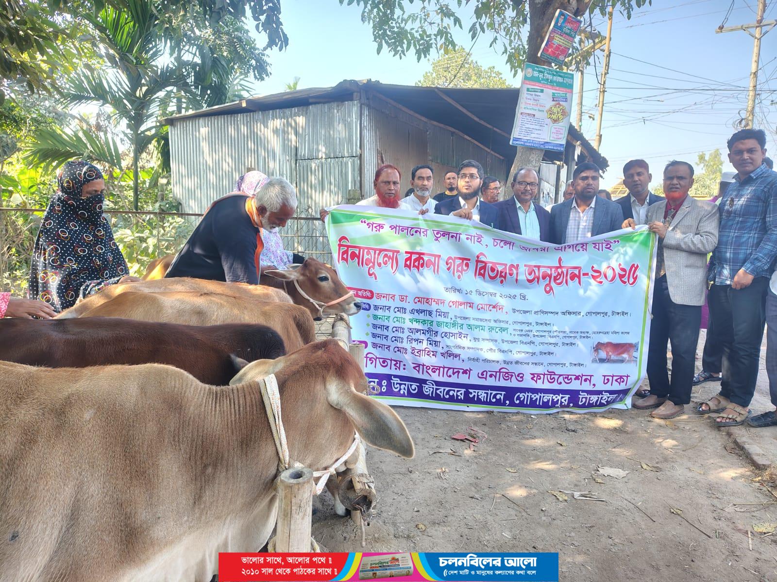 গরু পালনে তুলনা নাই, চলো আমরা এগিয়ে যাই প্রতিপাদ্যে বাংলাদেশ এনজিও ফাউন্ডেশন (বিএনএফ)-এর অর্থায়নে এবং বেসরকারি উন্নয়ন সংস্থা উন্নত জীবনের সন্ধানে (ঊষা)-এর বাস্তবায়নে টাঙ্গাইলের গোপালপুর উপজেলার কামদেব বাড়ি ও জাংগালিয়া গ্রামের ৭টি হতদরিদ্র পরিবারের মাঝে বিনামূল্যে ৭টি বকনা গরু বিতরণ করা হয়েছে। এ সময় উপজেলা প্রাণিসম্পদ দপ্তরের পক্ষ থেকে বিতরণকৃত গরুগুলোকে বিনামূল্যে ল্যাম্পি স্কিন ডিজিজের টিকা প্রদান করা হয়।