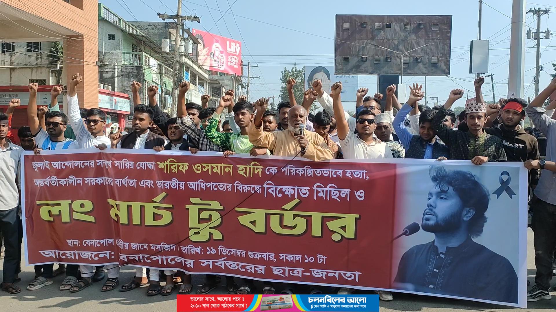 জুলাই আন্দোলনের সম্মুখ সারির যোদ্ধা শরিফ ওসমান হাদিকে পরিকল্পিতভাবে হত্যার প্রতিবাদে এবং অন্তর্বর্তীকালীন সরকারের ব্যর্থতা ও ভারতীয় আধিপত্যের বিরুদ্ধে বেনাপোলে বিক্ষোভ মিছিল ও ‘লং মার্চ টু বর্ডার’ কর্মসূচি অনুষ্ঠিত হয়েছে।
