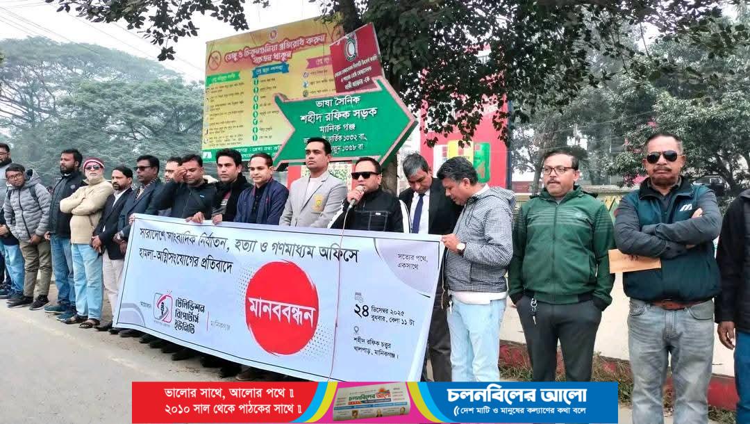 সারাদেশে সাংবাদিক নির্যাতন, হত্যা এবং গণমাধ্যম কার্যালয়ে হামলা ও অগ্নি সংযোগের প্রতিবাদে মানিকগঞ্জে মানববন্ধন পালন করেছে টেলিভিশন রিপোর্টার্স ইউনিটি মানিকগঞ্জ।