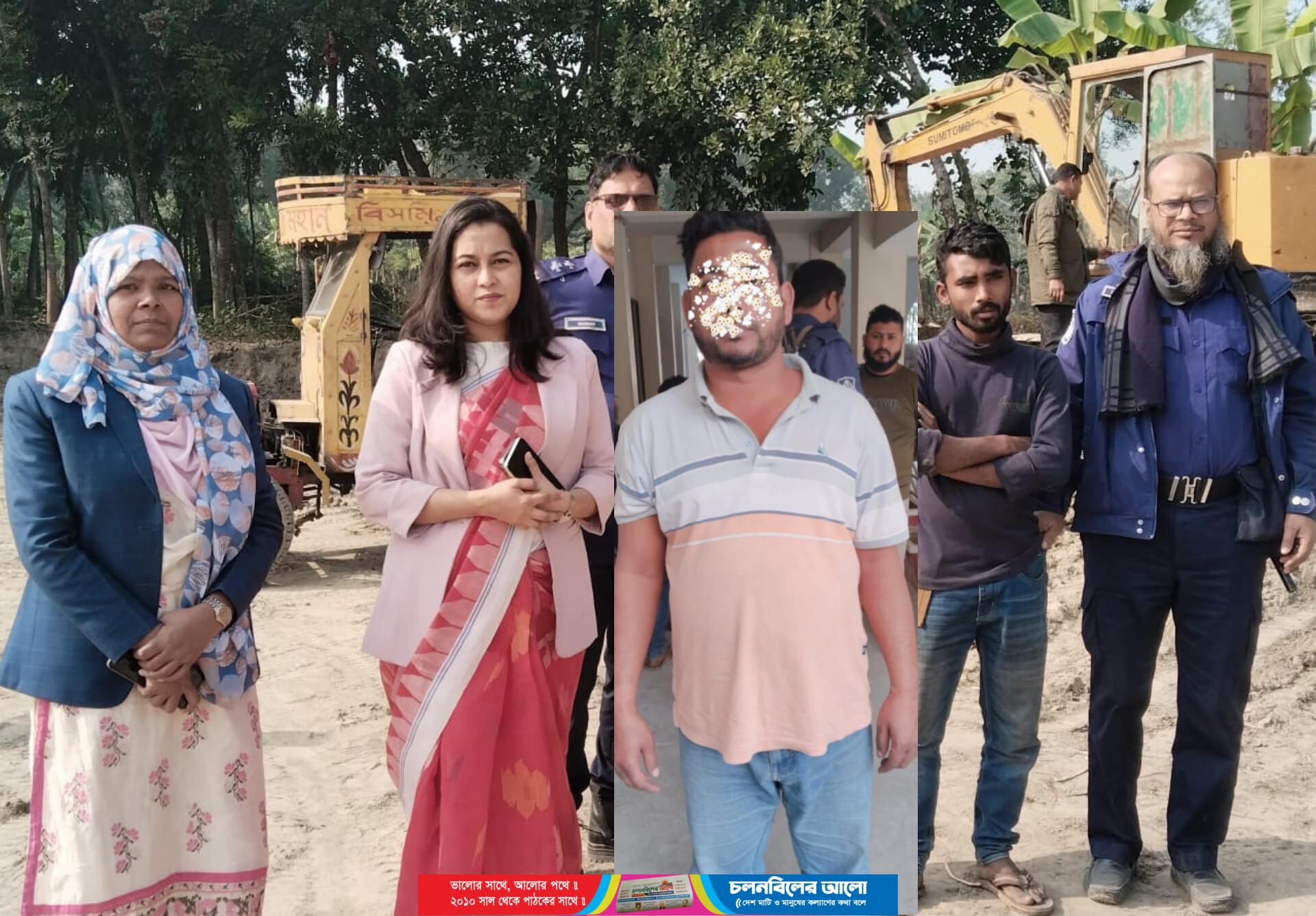 এসময় উপজেলা নির্বাহী অফিসার ও নির্বাহী ম্যাজিস্ট্রেট ফারজানা আক্তার তাকে হাতে নাতে ধরে ভ্রাম্যমাণ আদালত বসিয়ে বালুমহল ও মাটি ব্যবস্থাপনা আইন ২০২৩ এর ১৫ ধারা অপরাধে ৭ দিনের কারাদণ্ড ও ১ হাজার টাকা জরিমানা করা হয়। এসময় উপস্থিত ছিলেন উপজেলা নির্বাচন কর্মকর্তা ফাতেমা খাতুন।