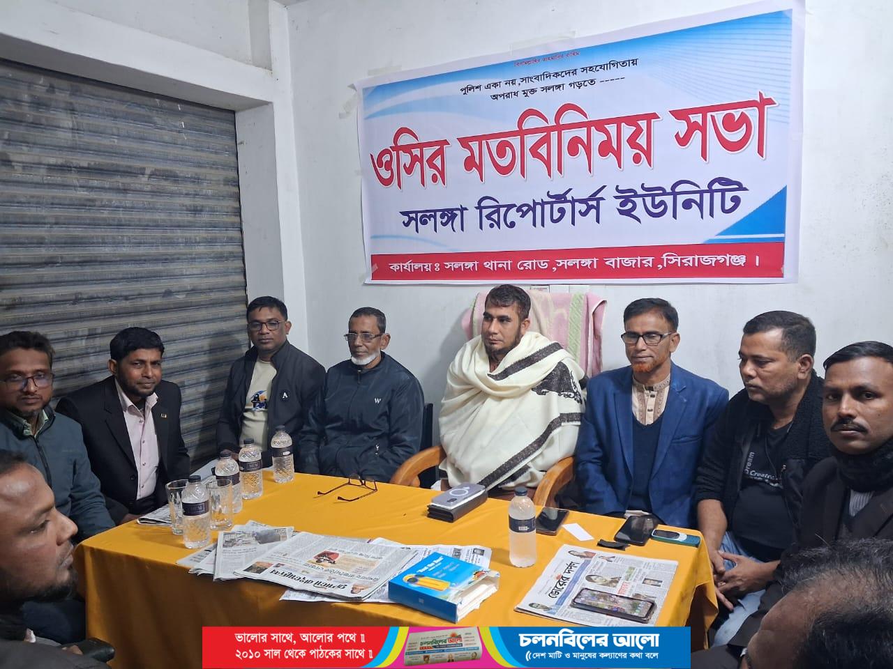 সিরাজগঞ্জের সলঙ্গা থানার অফিসার ইনচার্জ (ওসি) ইমাম জাফর সলঙ্গা রিপোর্টার্স ইউনিটির সাংবাদিকদের সাথে এক মতবিনিময় সভা করেছেন।আজ শুক্রবার সকাল ১০ টায় রিপোর্টার্স ইউনিটিতে উপস্থিত সাংবাদিকবৃন্দ ওসি ইমাম জাফরকে শুভেচ্ছা ও অভিনন্দন জ্ঞাপন করেন।মতবিনিময় সভায় উপস্থিত সাংবাদিকদের পরিচয় পর্ব শেষ করে আলোচনা সভা শুরু হয়।সংগঠনের সভাপতি সাহেদ আলীর সভাপতিত্বে আলোচনা সভায় উপস্থিত সাংবাদিকরা সলঙ্গায় অপরাধ দমনে পুলিশের ভূমিকা ও সংবাদ পরিবেশনের ক্ষেত্রে বিভিন্ন তথ্য উপাত্তের সত্যতা যাচাইয়ের জন্য থানা পুলিশের বক্তব্য,সাক্ষাৎকার ও সহযোগীতা আশা করেন।মত বিনিময় সভায় ওসি ইমাম জাফর তার বক্তব্যে সলঙ্গার আইন শৃঙ্খলার উন্নয়নে সততা ও নিষ্ঠার মাধ্যমে সর্বোচ্চ দায়িত্ব পালন করবেন বলে জানান।এক্ষেত্রে তিনি সাংবাদিকদের সহযোগীতা কামনা করেন।তিনি আরও বলেন,পুলিশ ও গণমাধ্যম কর্মীরা একে অপরের পরিপূরক।উভয়ে মিলে কাজ করলে সমাজের অপরাধ দমন ও জন সচেতনতা বৃদ্ধি করা সহজ হয়।আসন্ন ত্রয়োদশ জাতীয় সংসদ নির্বাচন অবাধ,সুষ্ঠ ও নিরপেক্ষ,সলঙ্গার আইন শৃঙ্খলা পরিস্থিতির উন্নতি ও সমাজ থেকে অপরাধ দমনে তিনি আবারো সাংবাদিকদের সহযোগীতা কামনা করেন।মতবিনিময় সভায় উপস্থিত ছিলেন,ওসি (তদন্ত) মনোজিত কুমার নন্দী,সলঙ্গা রিপোর্টার্স ইউনিটির সভাপতি সাহেদ আলী (দৈনিক তৃতীয় মাত্রা ও নিউজ বাংলা টোয়েন্টিফোর ফোর),সাধারণ সম্পাদক রফিকুল ইসলাম মন্টু (দৈনিক জনতা),সাংগঠনিক সম্পাদক কে.এম আল আমিন (দৈনিক বাংলাদেশ সমাচার ও চলনবিলের আলো), সহ-সভাপতি আনিসুর রহমান (দৈনিক সিরাজগঞ্জ প্রতিদিন),সহ-সাধারণ সম্পাদক হোসেন আলী (দৈনিক ভোরের দর্পণ),মহিলা বিষয়ক সম্পাদিকা জি.এম স্বপ্না (দৈনিক রূপালী বাংলাদেশ ও দৈনিক যমুনা প্রবাহ),কার্যকরী সদস্য এম.কারিকুল ইসলাম সুমন (দৈনিক মানবজমিন ও দৈনিক যমুনা প্রবাহ),কার্যকরী সদস্য সোহেল রানা (দৈনিক নয়া দিগন্ত ও স্বদেশের খবর),সদস্য আখতার হোসেন হিরন (দৈনিক মুক্ত খবর ও দৈনিক শ্যামল বাংলা),সদস্য আব্দুর রহিম (দৈনিক কলম সৈনিক) ও সদস্য সুলতান মাহমুদ (রাজধানী টিভি)।
