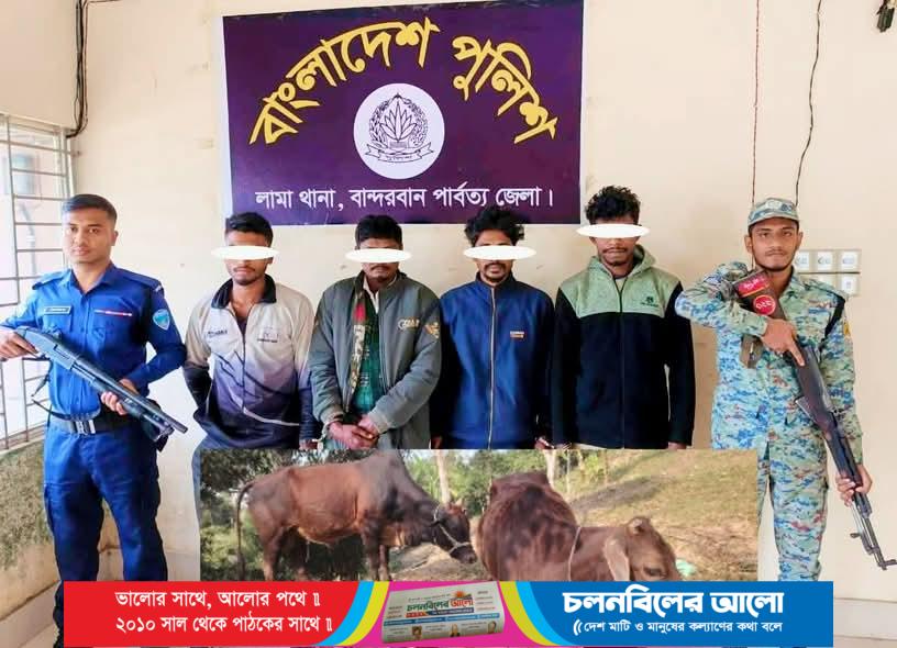 বান্দরবান পার্বত্য জেলার লামা থানা পুলিশের অভিযানে চোরাইকৃত দুইটি গরু ও টাকা উদ্ধারসহ চারজন চোরচক্রের সদস্যকে গ্রেপ্তার করা হয়েছে। অভিযানে গরু বিক্রির নগদ ৬২ হাজার টাকাও উদ্ধার করা হয়।